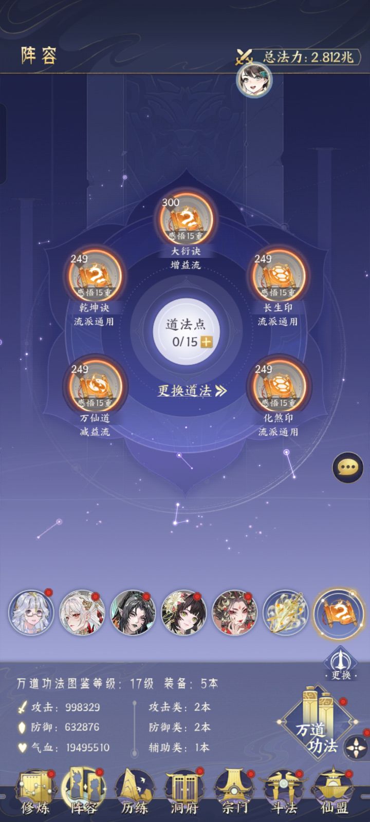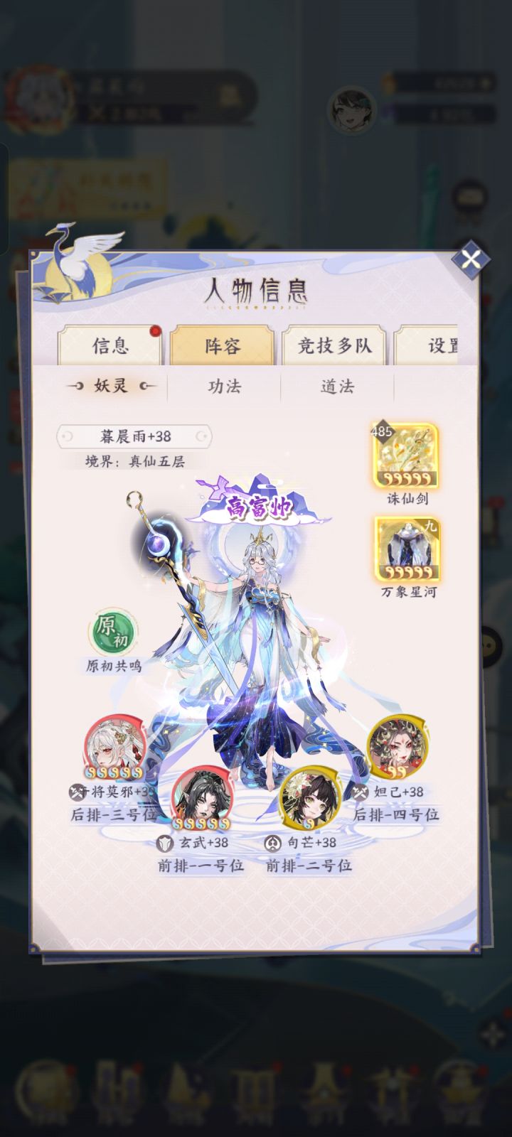 主角:孟婆本命点星+6干将:自己本命点星+3句芒:自己本命点星+1妲己:羲和本命点星+1玄武:混沌本命无点星(以上本命都已满星)诛仙剑带3星金莲保坦度仙甲:星河甲护佑三星鱼甲(治疗量溢出补充护盾)和满星地甲(满星了给的属性多一点(确信))思路:主角沧浪诀降攻,干将叠合璧buff,干将本命点星+3天罚能对全体降攻减防且未标明最多生效层数,妲己自身增益也强,句芒和玄武保命。(没想到把