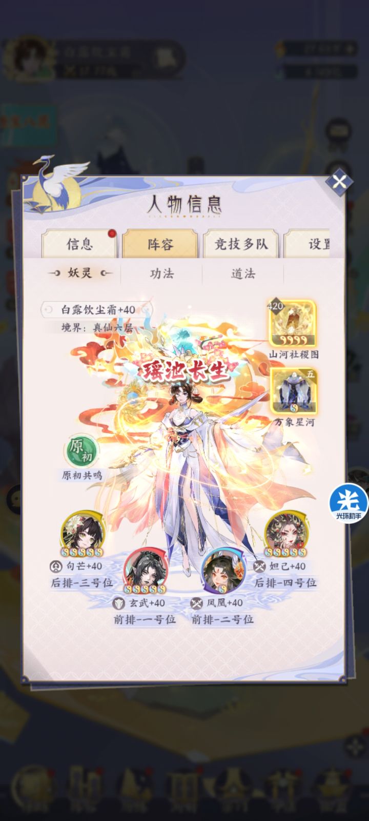 主c妲己二号位凤凰,然后句芒玄武随缘给位置。站位方面,凤凰建议顶在妲己前面,然后玄武前排送死就行(上玄武主要是因为她的被动前三回合限伤,保证队伍能安全度过前几回合,叠句芒免死和猴甲减伤还有妲己的被动)。句芒和妲己放后排即可,我个人喜欢把妲己放四号位苟着。仙甲方面星河必备(刚需五星以上),不然很难打得动对面。护佑鱼甲和猴甲是生存的主力(鱼甲建议八星以上)。神器方面社稷图必带,驱散增益➕控场,保
