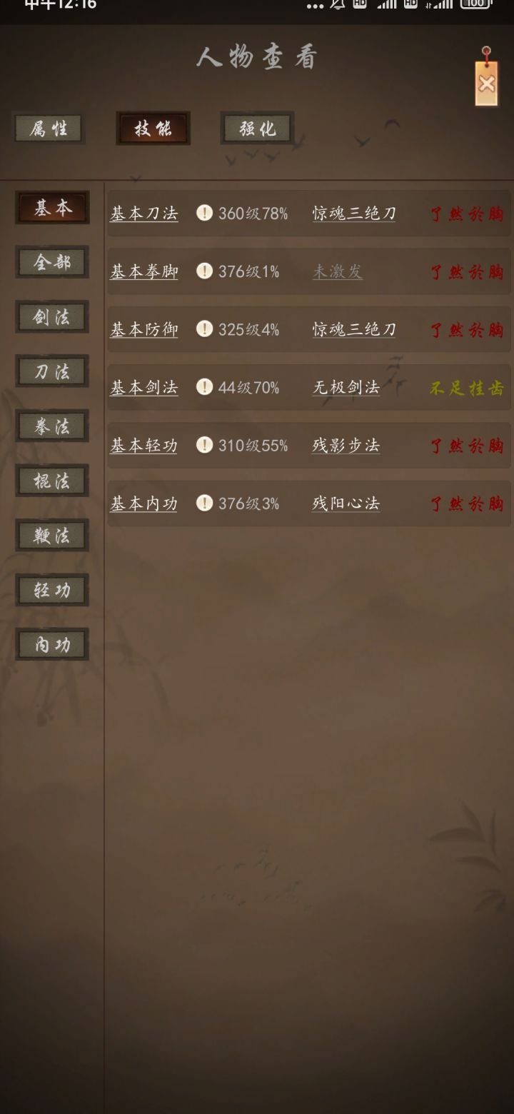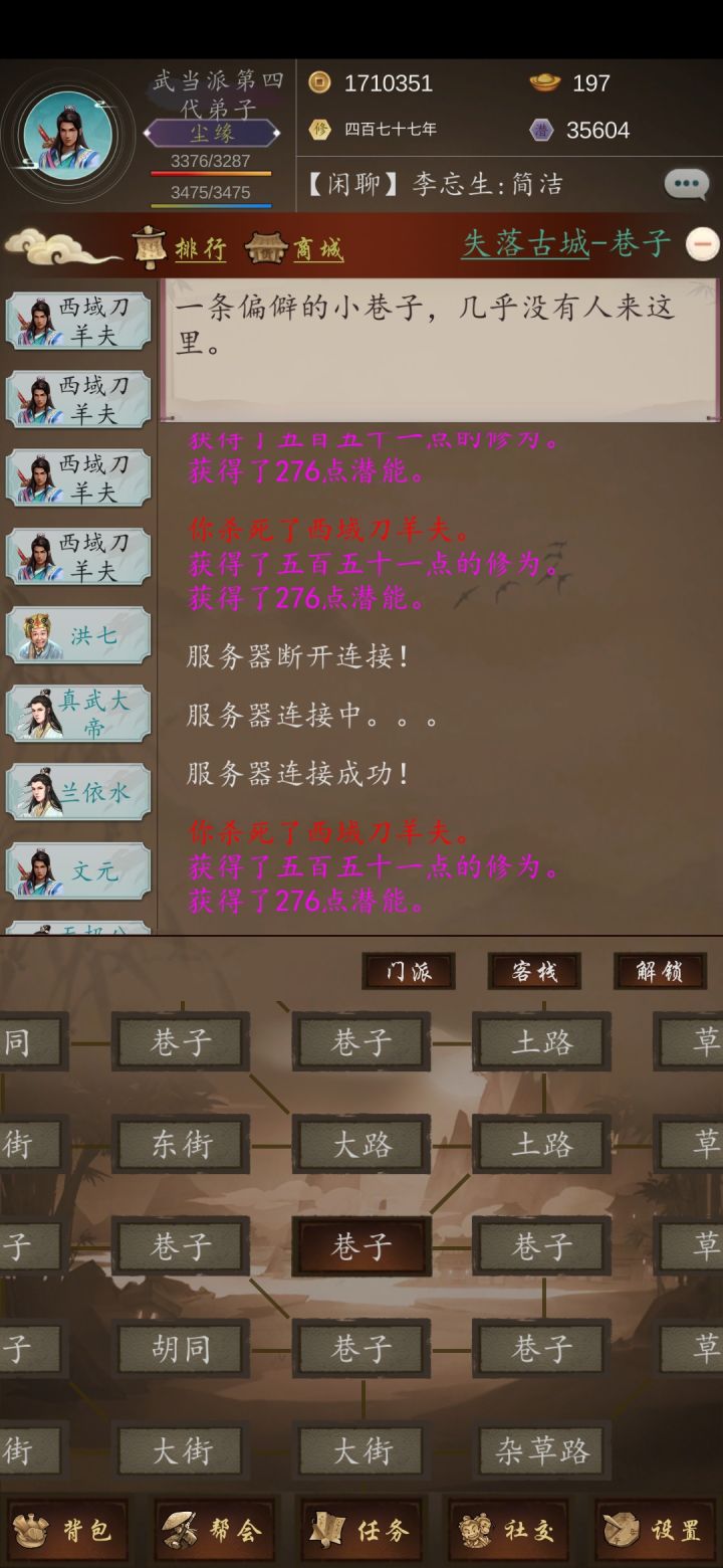 天下武林新手速成攻略作者:游戏ID 雪飘人间07/12/2021出门:1. 出新手村直接领三个礼包,店小二一个,邀请码888888, TapTapgold,各一个。然后可以关注下公告有没有那种限时或者节日兑换码。2. 客栈往上驿站,前几个都可以拜师,当前版本只有武当少林峨眉华山武堂五个门派。3. 学好技能后在头像-技能界面激发特殊技能。4. 门派师傅只能学到400级技能,400级之后