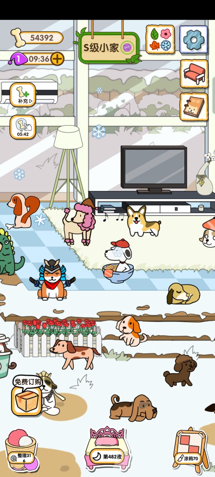 应该算是叭就是买完了家具养完了小狗quq小狗有些真的丑丑的quq所以我给好看的狗狗来了一个!特写ovo(就是喜欢好看的)三个游戏也都很有意思!我一开始玩的时候也想着睡觉那个游戏也可出个图鉴,然鹅真的太多关了,还是别要图鉴了quq放毛线球那个真的芜湖!最爱这个!涂鸦那个so easy芜湖跟着这款游戏更新了三次,大感觉就是比一开始有个季节变化还有涂鸦那个游戏,诶?是三次么quq而且quq我