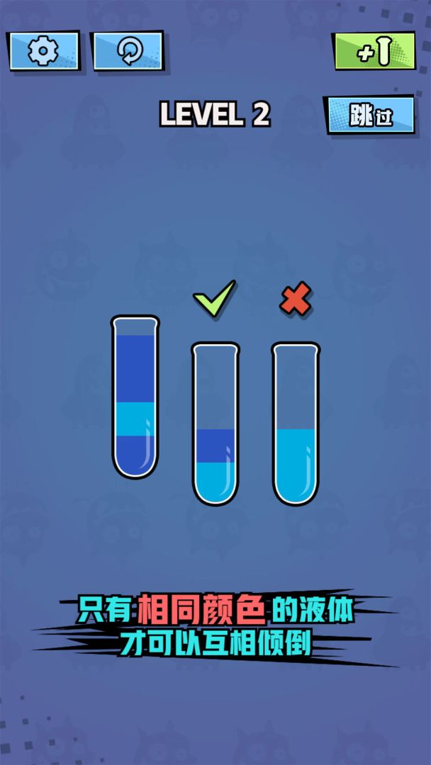 对玻璃杯中不同颜色的液体进行相互倒入归类排序,直到所有相同颜色的液体都在同一玻璃杯中。规则简单,但是需要相同的颜色并且玻璃杯上有足够的空间时,倒沙我最强液体才可以倒入,最终有效地训练对颜色,排序,拼图,空间感,整体感的认知。