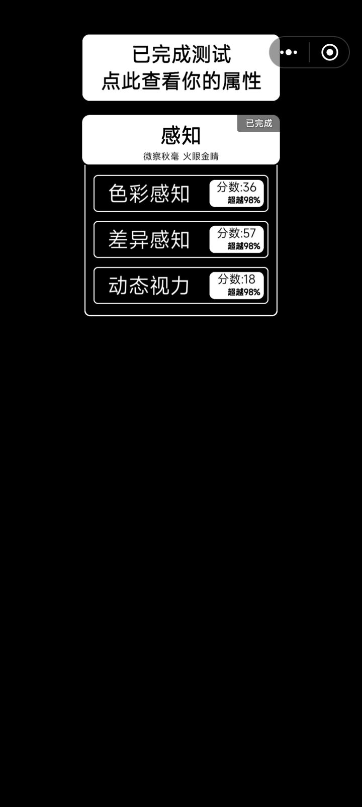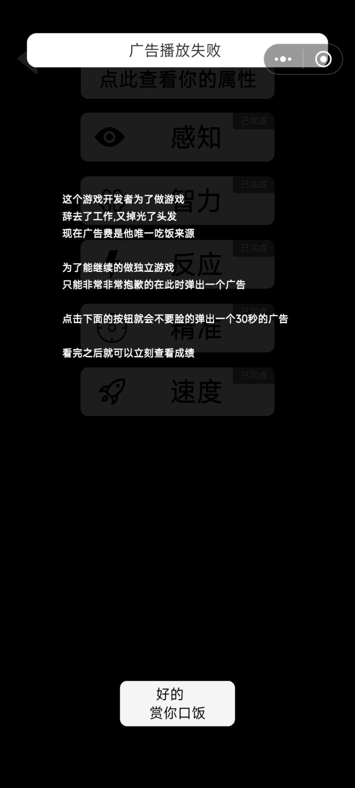 测速度的时候,手都冒烟了。最好每一次都认真对待,不然的话,你会总想看广告,获得再来一次的机会的。每次开始之前规则要认真看。我就是因为没认真看规则,开始的时候两眼一抹黑,只能重新来另外就是那个测试瞬间记忆的,原来是按照颜色记的,我看规则还以为是按数字记的,重启了几次,还以为出bug了。规则最好还是写清楚一点。可惜了,我记颜色就没有记数