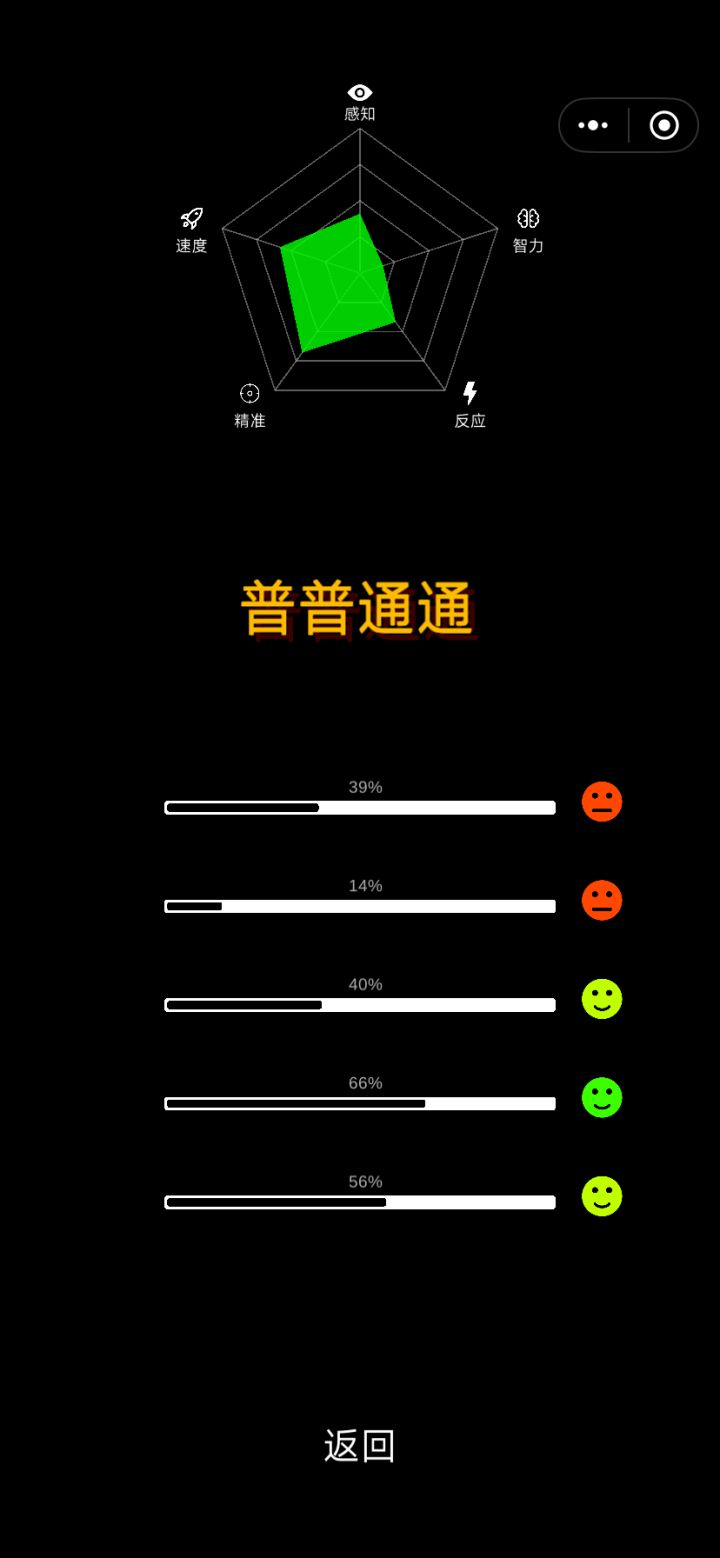 测速度的时候,手都冒烟了。最好每一次都认真对待,不然的话,你会总想看广告,获得再来一次的机会的。每次开始之前规则要认真看。我就是因为没认真看规则,开始的时候两眼一抹黑,只能重新来另外就是那个测试瞬间记忆的,原来是按照颜色记的,我看规则还以为是按数字记的,重启了几次,还以为出bug了。规则最好还是写清楚一点。可惜了,我记颜色就没有记数