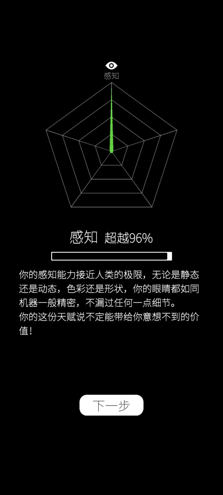 反应和速度双低,感知最高。还是比较符合我这个只会在家画画的阿宅的(😭看了半天也没人和我一样接木棍0分)[最强大脑]你也来玩吧 感知超越全球96% 智力超越全球87% 精准超越全球64% 反应超越全球89% 速度超越全球71% 你也来试试吧https://www.taptap.com/app/213413#我的属性
