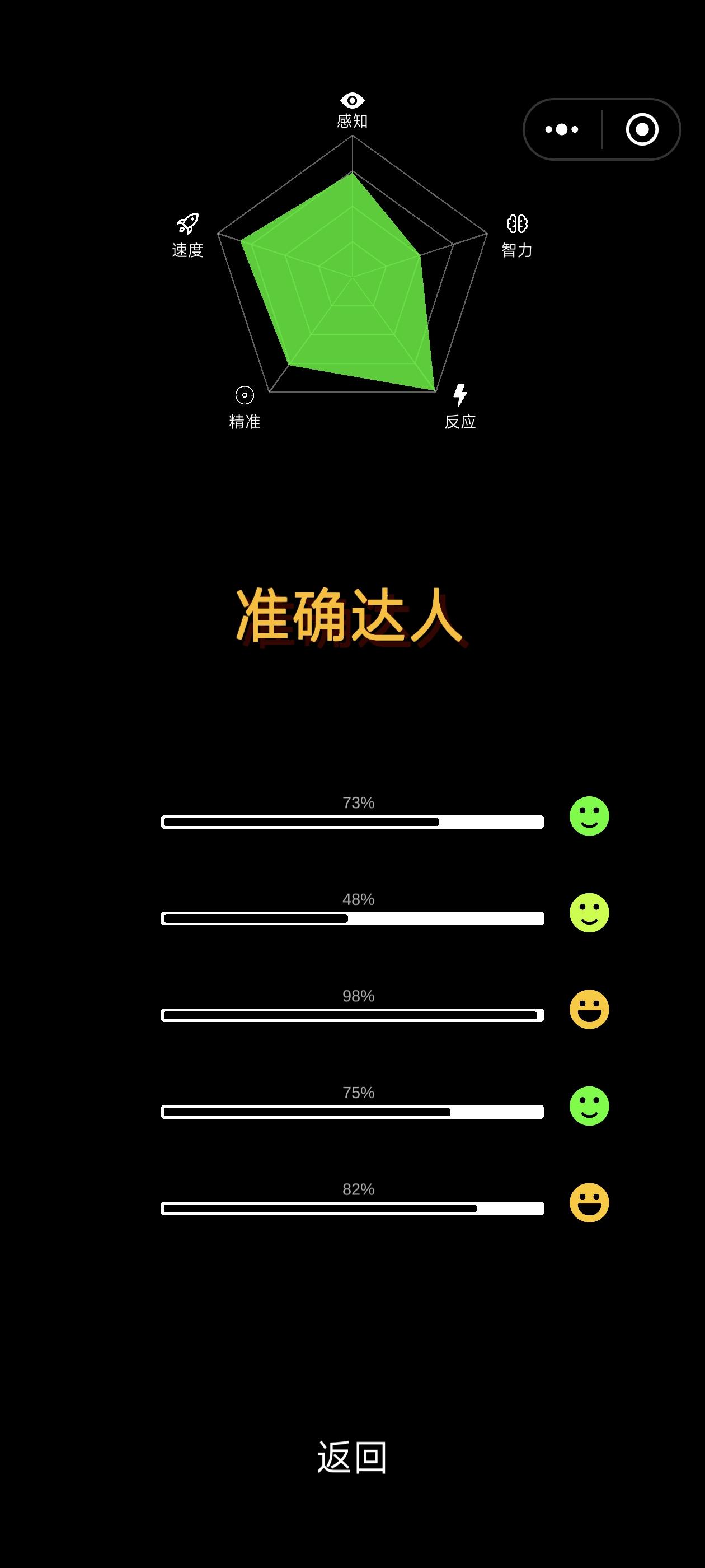 反应和速度双低,感知最高。还是比较符合我这个只会在家画画的阿宅的(😭看了半天也没人和我一样接木棍0分)[最强大脑]你也来玩吧 感知超越全球96% 智力超越全球87% 精准超越全球64% 反应超越全球89% 速度超越全球71% 你也来试试吧https://www.taptap.com/app/213413#我的属性