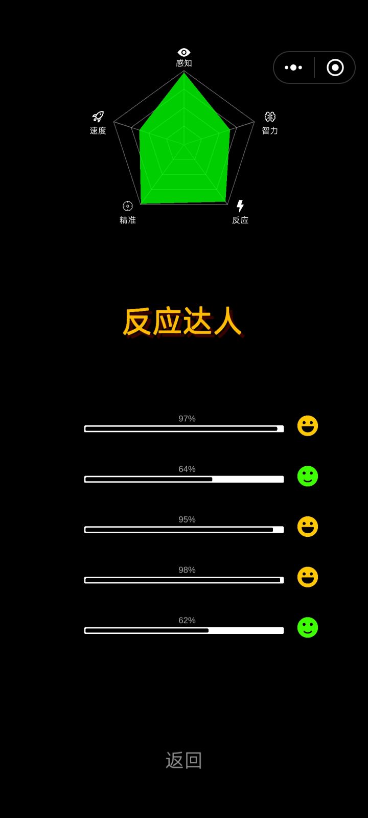 我在app中获得高分 你敢来挑战我吗感知超越全球97%智力超越全球98%精准超越全球96%反应超越全球97%速度超越全球86%你也来试试吧