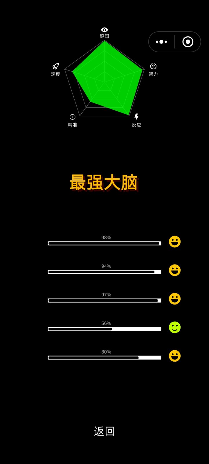 我在app中获得高分 你敢来挑战我吗感知超越全球97%智力超越全球98%精准超越全球96%反应超越全球97%速度超越全球86%你也来试试吧