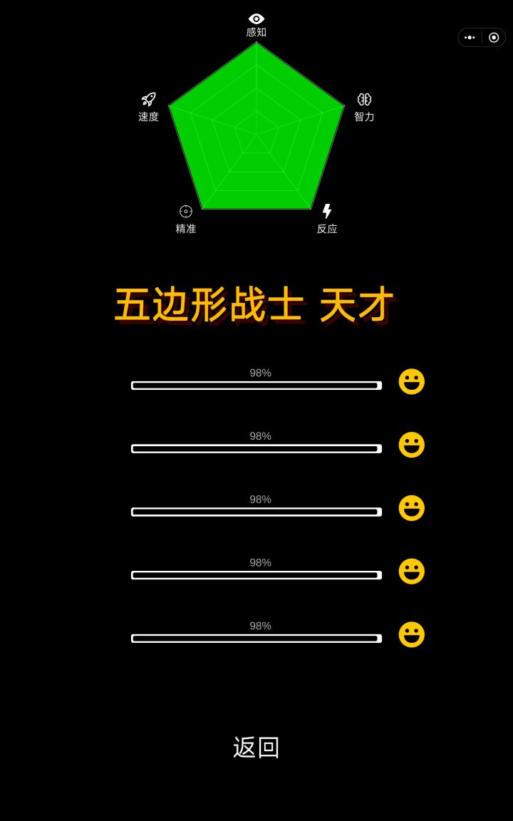 反应和速度双低,感知最高。还是比较符合我这个只会在家画画的阿宅的(😭看了半天也没人和我一样接木棍0分)[最强大脑]你也来玩吧 感知超越全球96% 智力超越全球87% 精准超越全球64% 反应超越全球89% 速度超越全球71% 你也来试试吧https://www.taptap.com/app/213413#我的属性