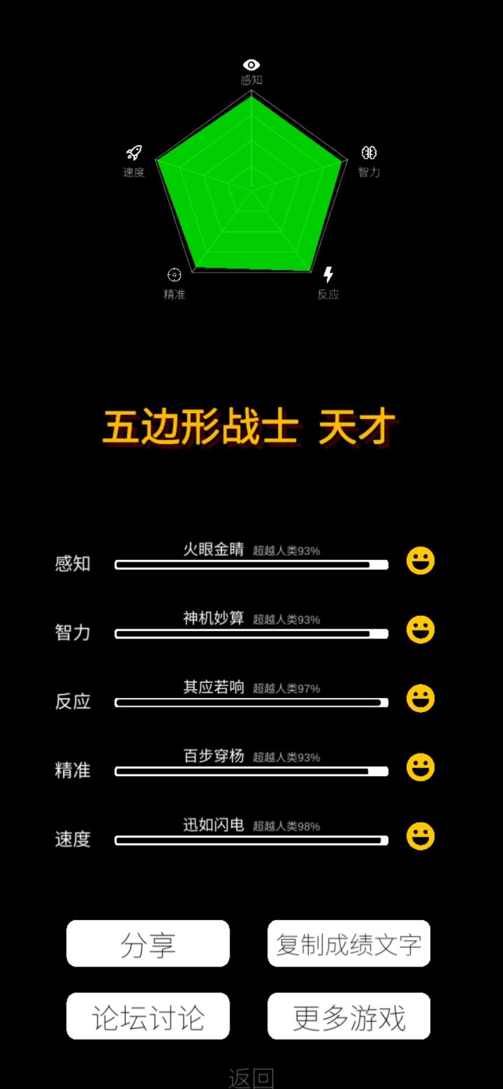 其实吧这游戏没啥真实度。说实话我就怕有些人傻傻觉得这很靠谱。其实哪怕第一次测出五边形也只是普通人而已。真正的天才不会在这旮瘩向别人证明自己是天才。只有普通人才会认不清自己的本质是什么。从而喜欢做各种非权威测试来麻痹自己。何其可笑可悲。真有这个意向的。智力可以做些权威性的测试。反应去知乎上找,有人发。也可用尺子粗略自测。精准去微信用那个跳一跳测。感知就不说了。因为自己心里应该清楚。诗词写得出来吗?能感知自己的心跳嘛?能在视野范围内有东西动就马上反应过来嘛?能察觉因自己的指纹不平导致和纸面接触受到了的不同的摩擦力嘛?都行的话感知还不错。不行就是普通人。这个自己判断即可。