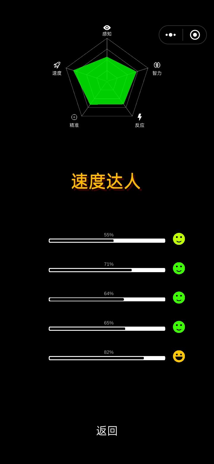 反应和速度双低,感知最高。还是比较符合我这个只会在家画画的阿宅的(😭看了半天也没人和我一样接木棍0分)[最强大脑]你也来玩吧 感知超越全球96% 智力超越全球87% 精准超越全球64% 反应超越全球89% 速度超越全球71% 你也来试试吧https://www.taptap.com/app/213413#我的属性