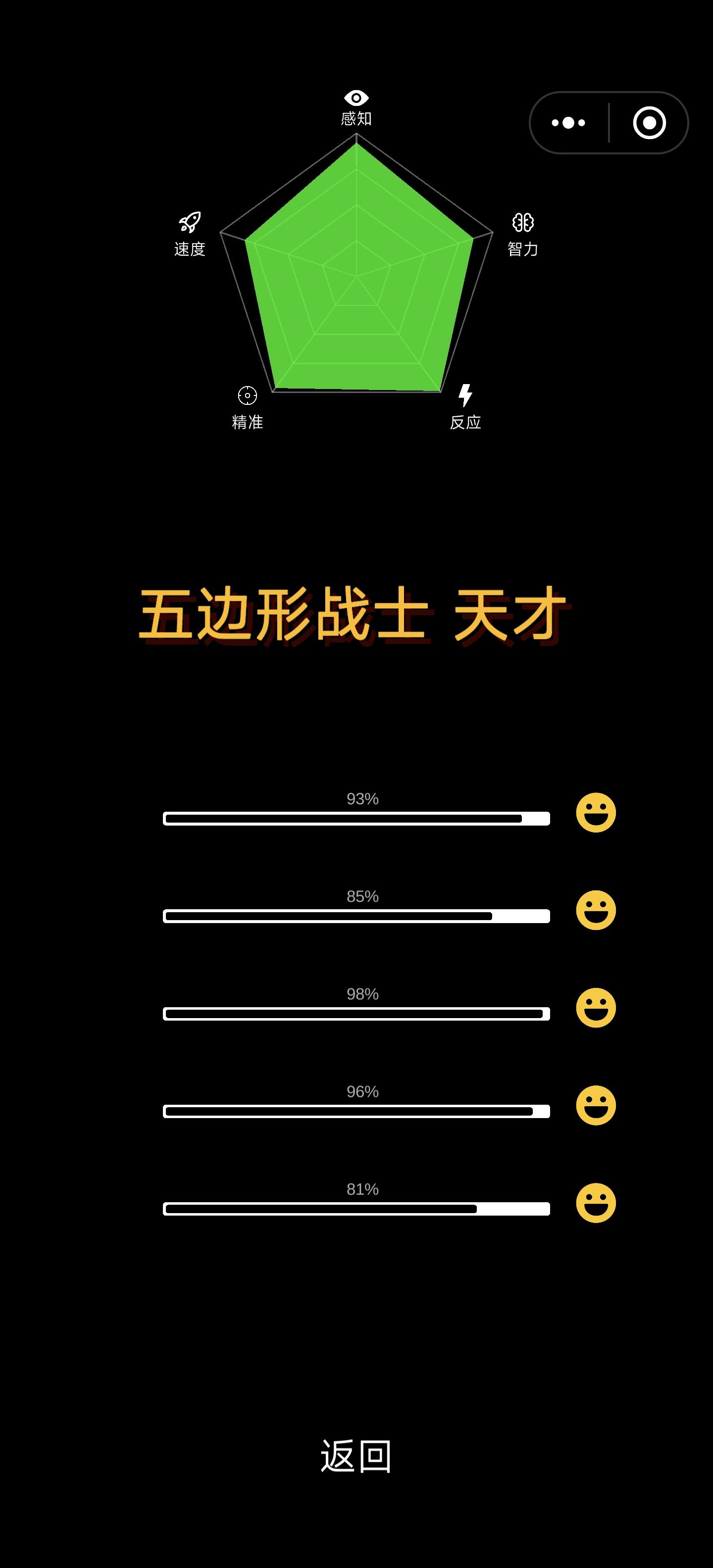 不知道是反直觉还是啥,感觉智力低了点能有个88%?,反应和精准虚高太多(能有个70%不错了😅)当然游戏测试和自我认知都是图一乐😅测试里的房子小人很不错,完成测试后又玩了两遍,挺有意思的。瞬间记忆又要记颜色又要记位置有点为难我,玩了两遍也只有5分😅