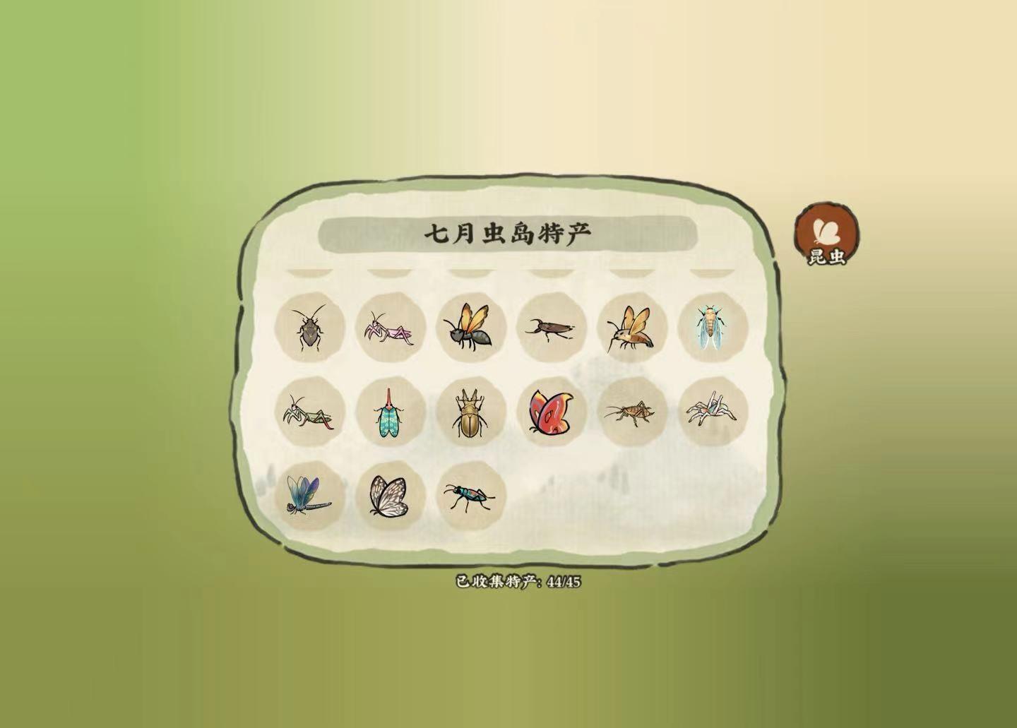 雾天太少了,第一天就只差锹甲了,结果第三天又蹲了几小时才出。判断雾天小技巧:比如青凤蝶、飞蛾,我敢说只要晴天大风天肯定有,但是现在没下雨也没见到它们,大概率是雾天了,此法适用于挂机时不时看一眼天气的摸鱼党,以及强退刷新天气党。 难度排行:吹雪蝉,晚上+雨天+树虫+两圈无连格 然后是蜘蛛、蜻蜓(雨)和虎甲,一圈无连格 锹甲的雾天很难等,但是一圈有大量连格。 策划往虫岛塞菜粉蝶,往大浅鱼影塞海带,真是