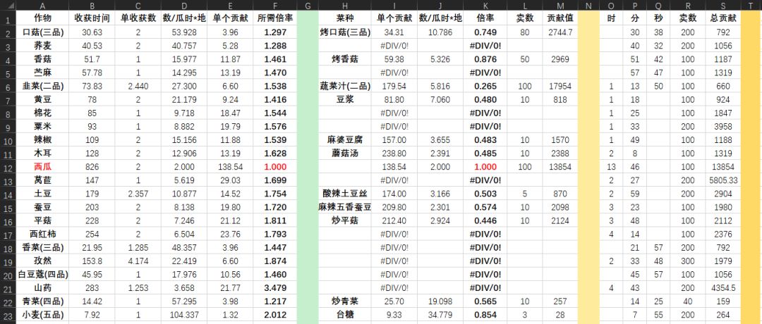 #仙山小农攻略征集 #游戏攻略 #仙山小农公测 #仙山小农快速升级 最新的可跳转至→→种植做菜贡献详细表 ⬇️⬇️⬇️⬇️(旧版) 记得长按图片保存哦![表情_看我的] 肝了一天多天,因为很多菜要做,很多菜要种。很多数据要记录,很多计算公式要写。导致我什么都没干,全在种菜。工作量非常大,希望能帮到各位友友。 我不对表作过多的赘述,已经足够详细了。 1.图1倍率指,达到该倍率时,贡献流量等同于