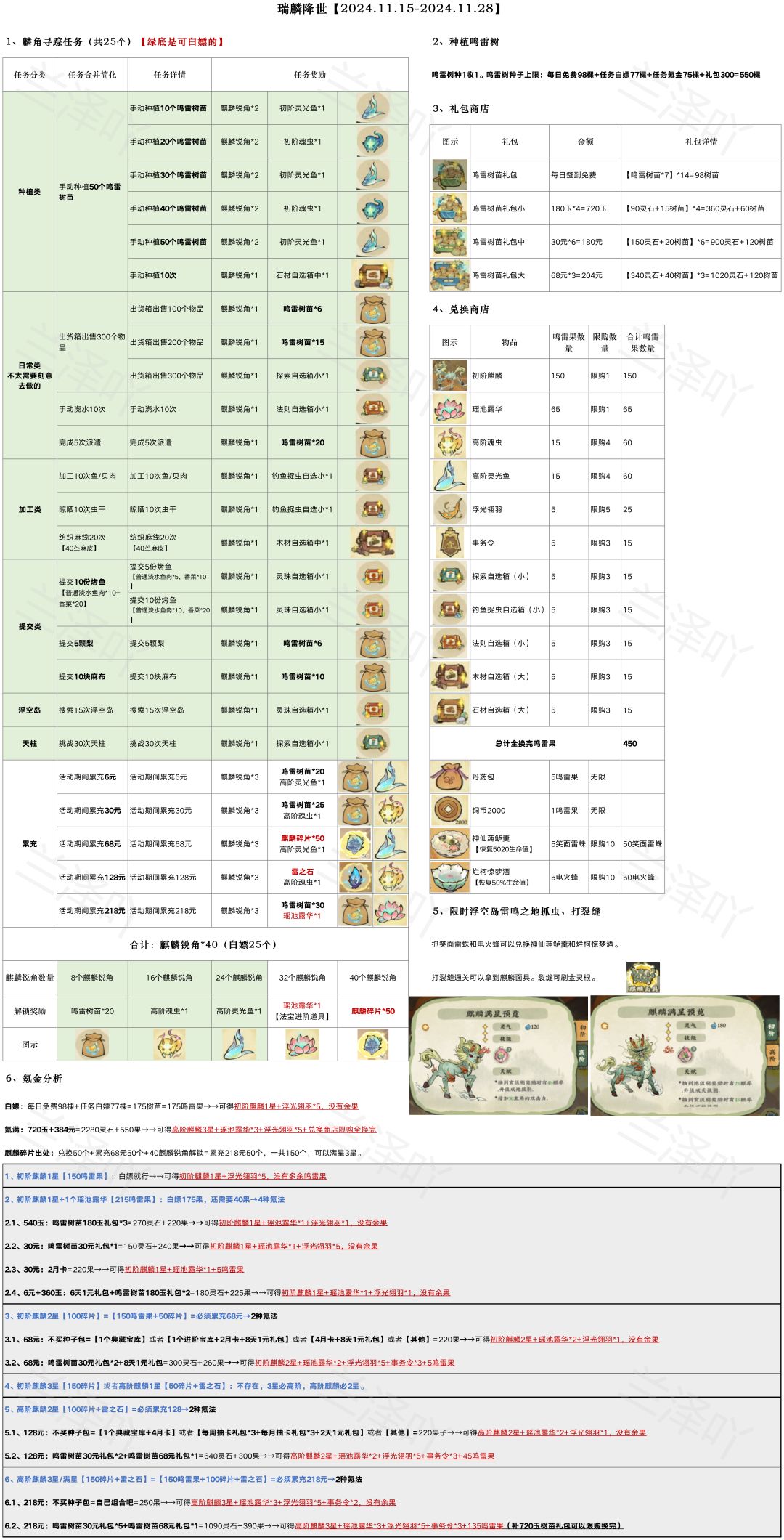 瑞麟降世【2024.11.15-2024.11.28】活动攻略版本1.0【简化,详细看图】 1、初阶麒麟1星【150鸣雷果】:白嫖就行→可得初阶麒麟1星+浮光翎羽*5,没有多余鸣雷果 2、初阶麒麟1星+1个瑶池露华【215鸣雷果】:540玉树苗礼包/累充30元/累充6元+360玉树苗礼包 3、初阶麒麟2星【100碎片】:必须累充68元 4、初阶麒麟3星或者高阶麒麟1星:不存在,3星必高阶,高阶麒麟