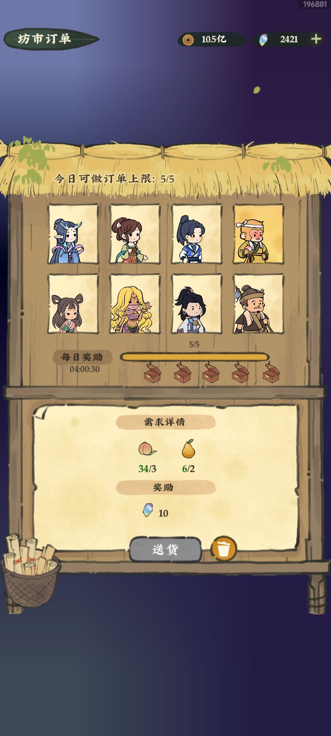 🍎接着讲萌新应该知道的内容。 🍎每天的订单应该只提交最简单的,如萝卜,青菜,韭菜这种低价值低级作物的订单,不提交任何菜肴。如图一所示,送货按钮旁有个删除按钮,八个订单,每天做之前,全删一遍,删了之后去箱子仓库里面,把背包里所有的菜肴和高级农作物存进仓库,然后取出一些低级作物,如萝卜,青菜等,这样30分钟后刷新出来的订单就是纯粹的萝卜和青菜等组成的订单,因为订单刷新规则是会自动检测玩家背包里有些啥内