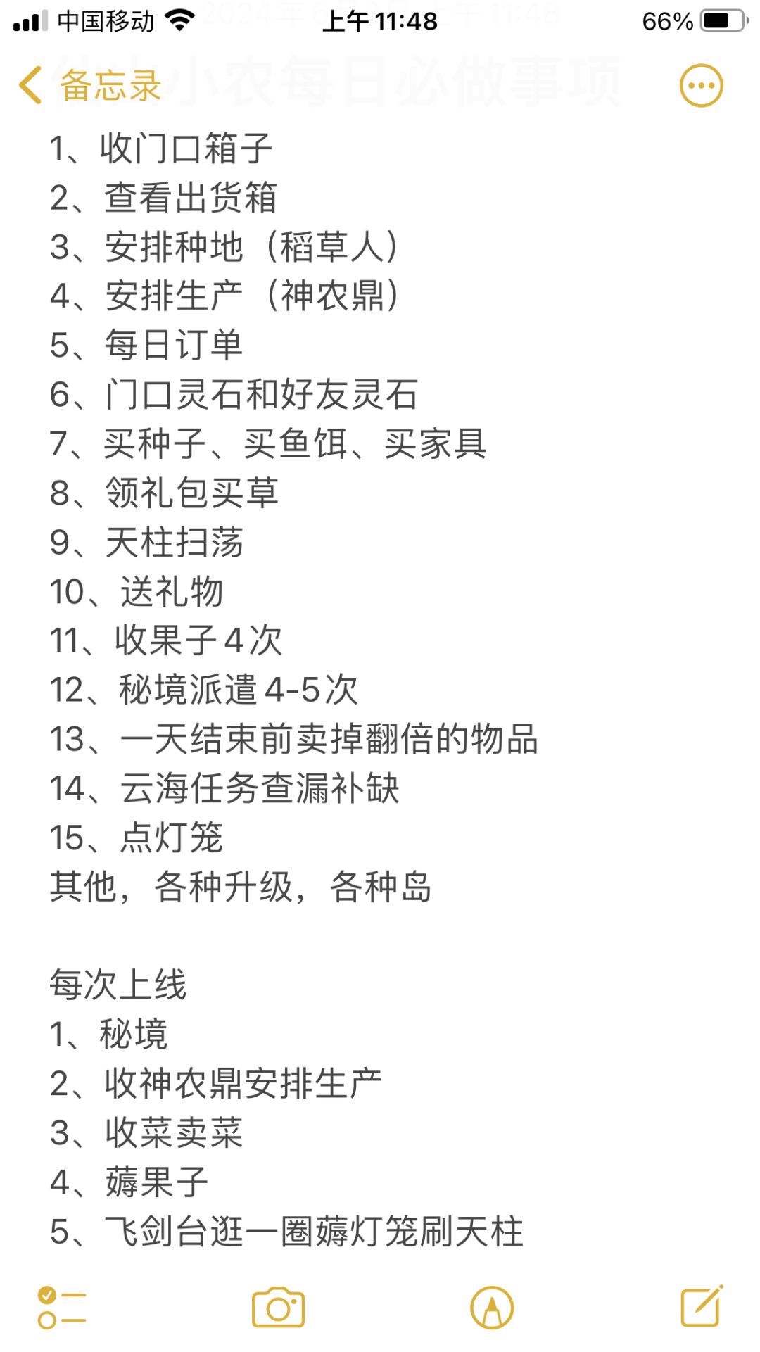 玩了一个月已经常态化了,有鼎之后也轻松不少,盘点了下每天要做的事,和每次上线要做的事,可以对一下不要漏就好了。没空时候一天上个三四次(一次安排生产种地,其余看看秘境)也行,有空就挂着刷鱼刷虫也行。 仙山小农每日必做事项 1、收门口箱子 2、查看出货箱 3、安排种地(稻草人) 4、安排生产(神农鼎) 5、每日订单 6、门口灵石和好友灵石 7、买种子、买鱼饵、买家具 8、领礼包买草 9、天柱扫荡 1