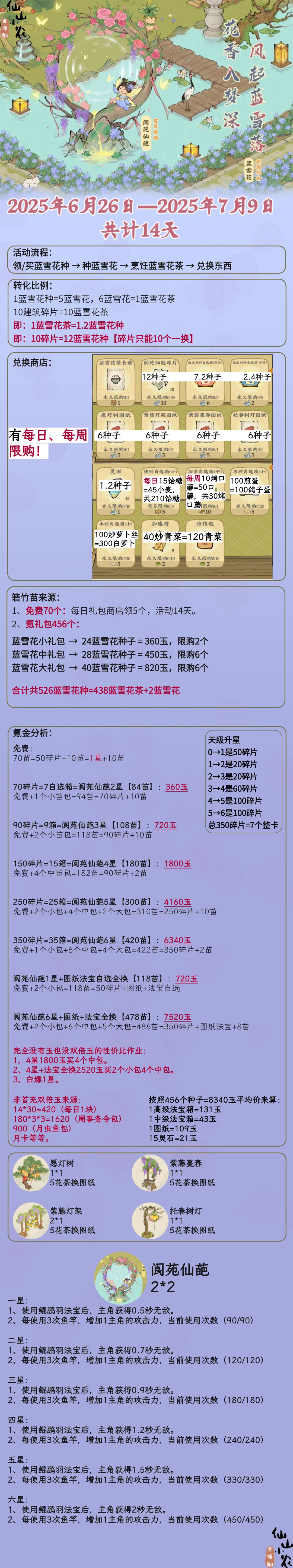此次活动如果有朱雀玉双倍的话,是比较划算的,没有双倍就……嫌弃[表情_嫌弃] 关于榕树值不值得,苒冉老师有发帖,可以自己衡量一下。 https://www.taptap.cn/moment/636944871579453211?utm_medium=share&utm_source=copy&share_id=365EA792AC25 按照456个种子=8340玉平均价来算: 1高级法宝箱=131
