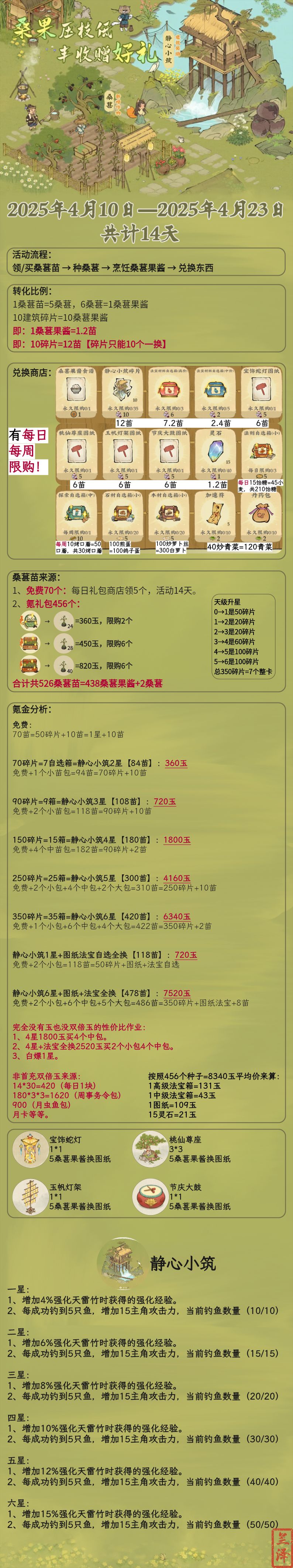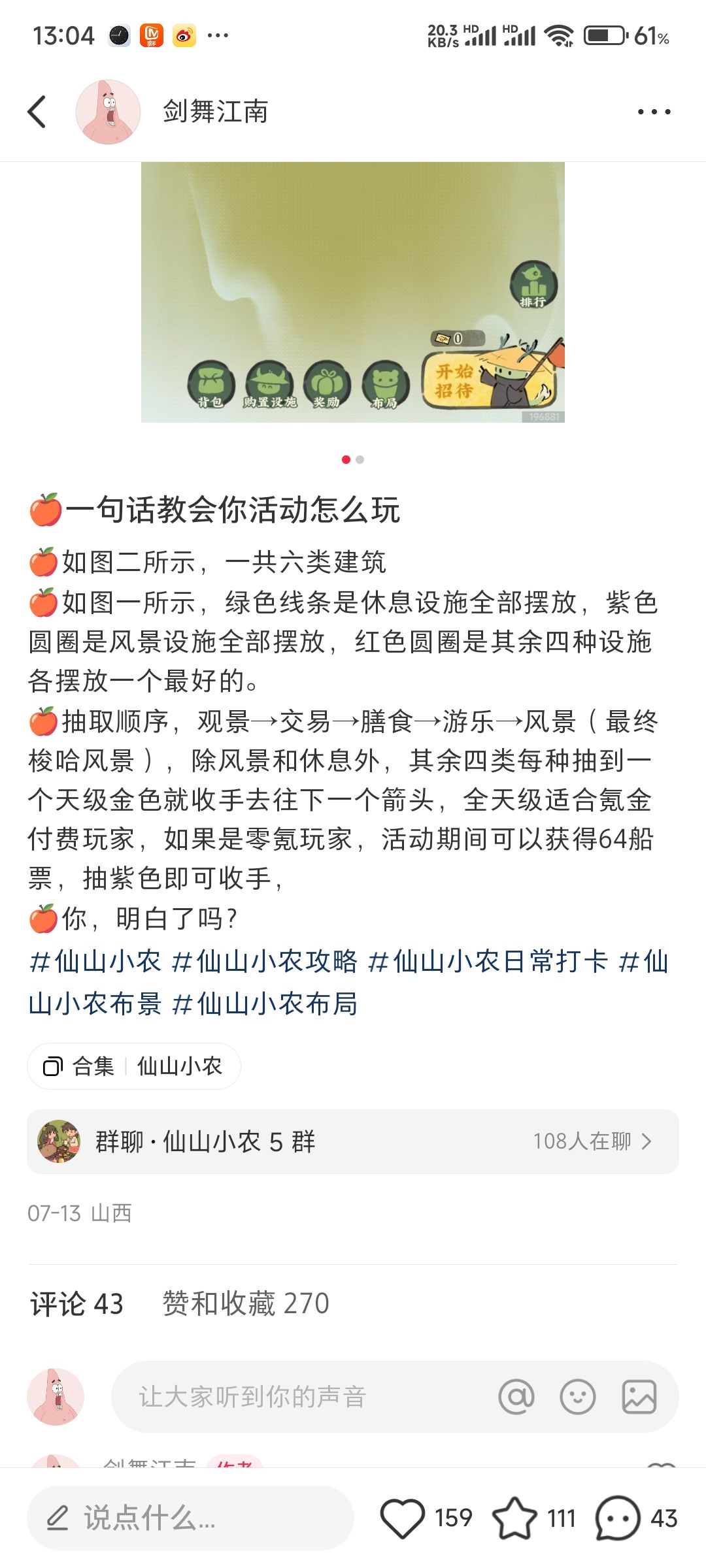 🍎如图二所示,一共六类建筑 🍎如图一所示,绿色线条是休息设施全部摆放,紫色圆圈是风景设施全部摆放,红色圆圈是其余四种设施各摆放一个最好的。 🍎抽取顺序,观景→交易→膳食→游乐→风景(最终梭哈风景),除风景和休息外,其余四类每种抽到一个天级金色就收手去往下一个箭头,全天级适合氪金付费玩家,如果是零氪玩家,活动期间可以获得64船票,抽紫色即可收手, 🍎你,明白了吗? #山精游幸攻略征集