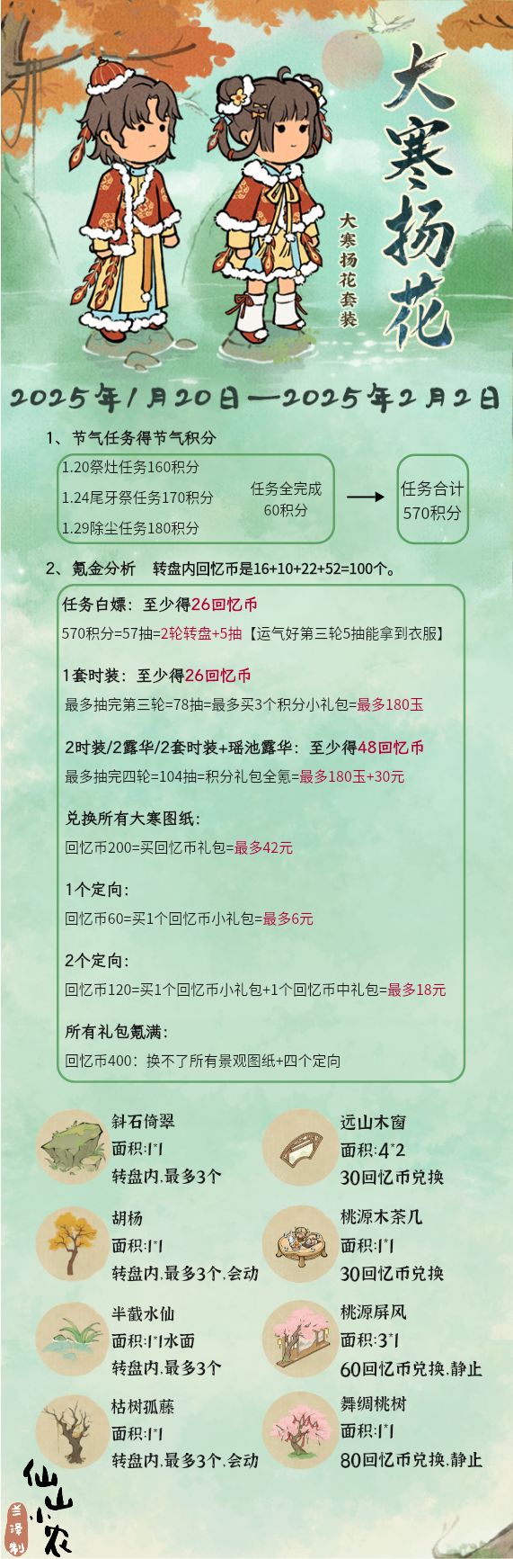 不用纠结什么布局,或者买什么设施的。没必要,你只需要把你想买的礼包买了,每天签到船票都用了,奖励就到手了。 至于白花素冠心兰和排行榜,看个笑话就得了,没必要较真。