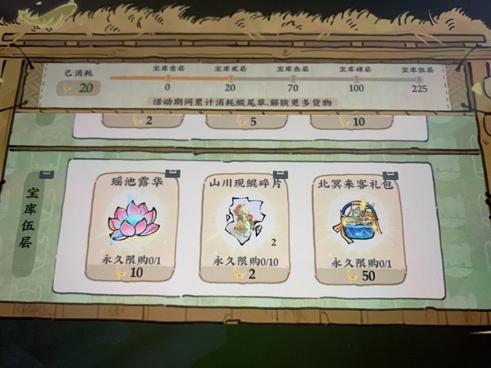 赏鲲集市一共有五层,每层需要消耗鲲尾草才能解锁,坐骑九华鲲在最后一层,想要拿到需要消耗累计275个鲲尾草。 活动期间玩家可以免费获得攻击90个(赏鲲基础7日礼20个+每日鲲鳞礼包共70个) 所以需要付费拿185个鲲尾草: 360朱雀玉可以买两个小礼包得30鲲尾草(小月卡买一次给300朱雀玉) 68云赏鲲典藏礼签到6天得44鲲尾草; 还剩111个鲲尾草,只能买礼包了。68礼包买两个,30礼包买