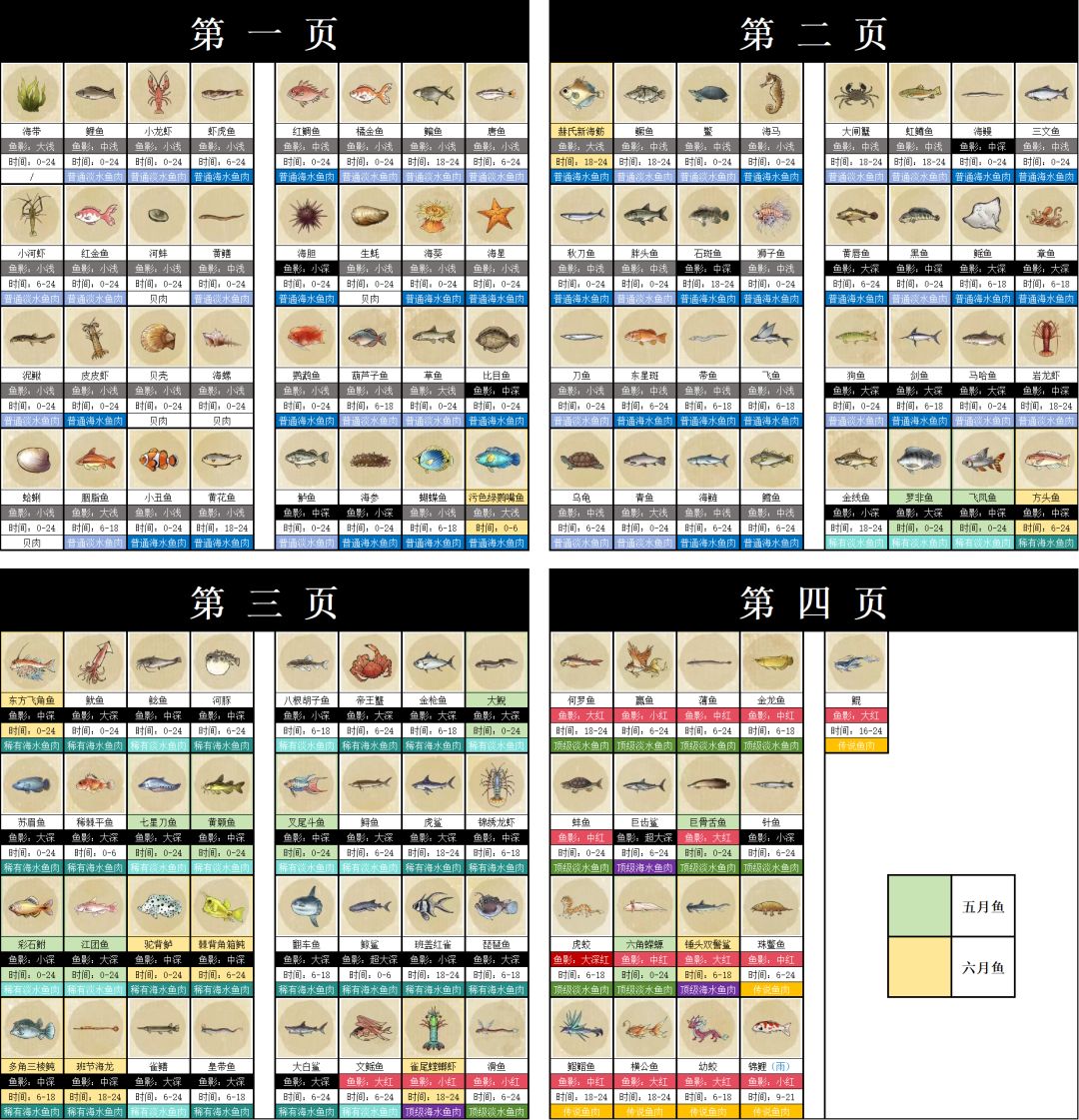 图鉴均为神农书和岛内图鉴顺序排列!!!时间是现实时间!!!天气是图内天气!!! 钓鱼任务:蛤蜊(海边浅滩)、带鱼(小海岛、海边浅滩)、锦绣龙虾(小海岛)、锦鲤(后山、桃源雅集) 划重点:有些鱼的结束时间和开始时间有偏差一个小时左右(举例:虎蛟6-18 横公鱼18-24,偏差成虎蛟6-19 横公鱼19-24;不用纠结哪些鱼有偏差,在图鉴时间内钓鱼就行了) 24年6月15日更新内容: ①更改神农书和岛