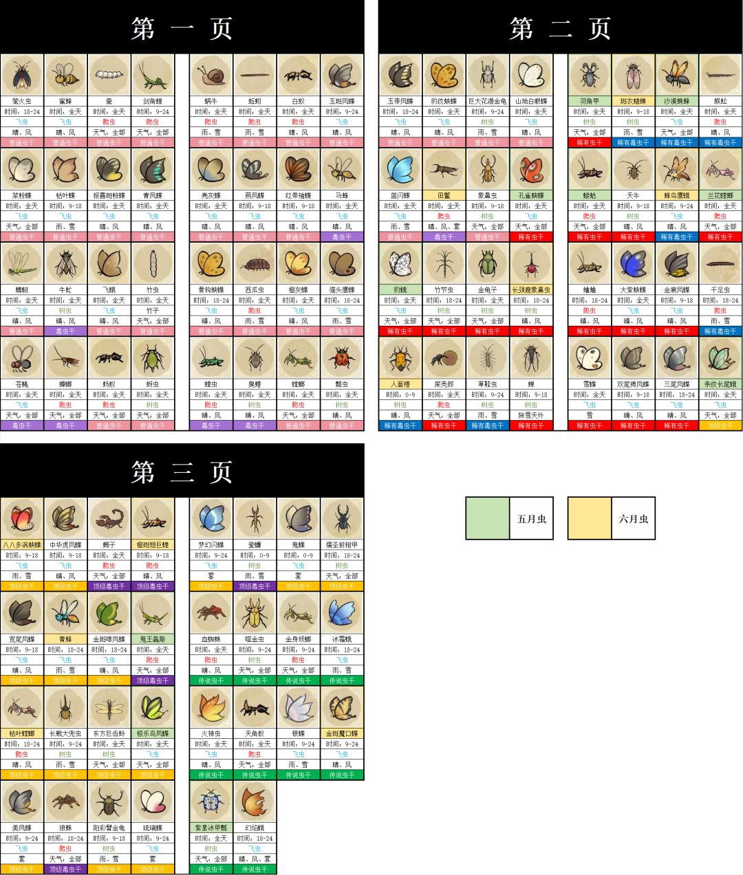 图鉴均为神农书和岛内图鉴顺序排列!!!时间是现实时间!!!天气是图内天气!!! 划重点:有些虫的结束时间和开始时间有偏差一个小时左右(举例例子看钓鱼篇,具体哪些虫就不知道了,在图鉴时间内抓就行了,不用纠结哪些昆虫有偏差) 24年6月15日更新内容: ①更改神农书和岛图排版; ②新增六月虫岛图鉴; ③新增仙山图鉴; 昆虫图鉴大全是与玩友 羡鱼 共同努力制作 感谢以下玩友的图鉴补全:温玉、是栗川不是粟
