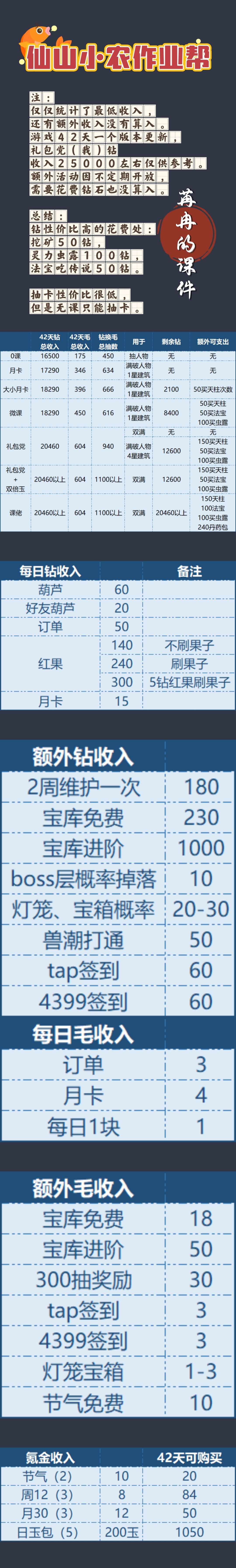 https://kdocs.cn/l/cqUN70Wx6aZr 这是很早之前做的小农攻略表放在群里用的,这是个协作文档,有改动所有人实时共享的那种,电脑手机都能看,电脑方便一点,不过很多数据得自己筛选排序。 筛选用完后请恢复原样!想自己方便的话,可以另存一份,然后可以取消保护区自己随意改了。 近期因为我自身工作关系,所以表格更新会慢非常多。【而且也没啥可以特别更新的了】