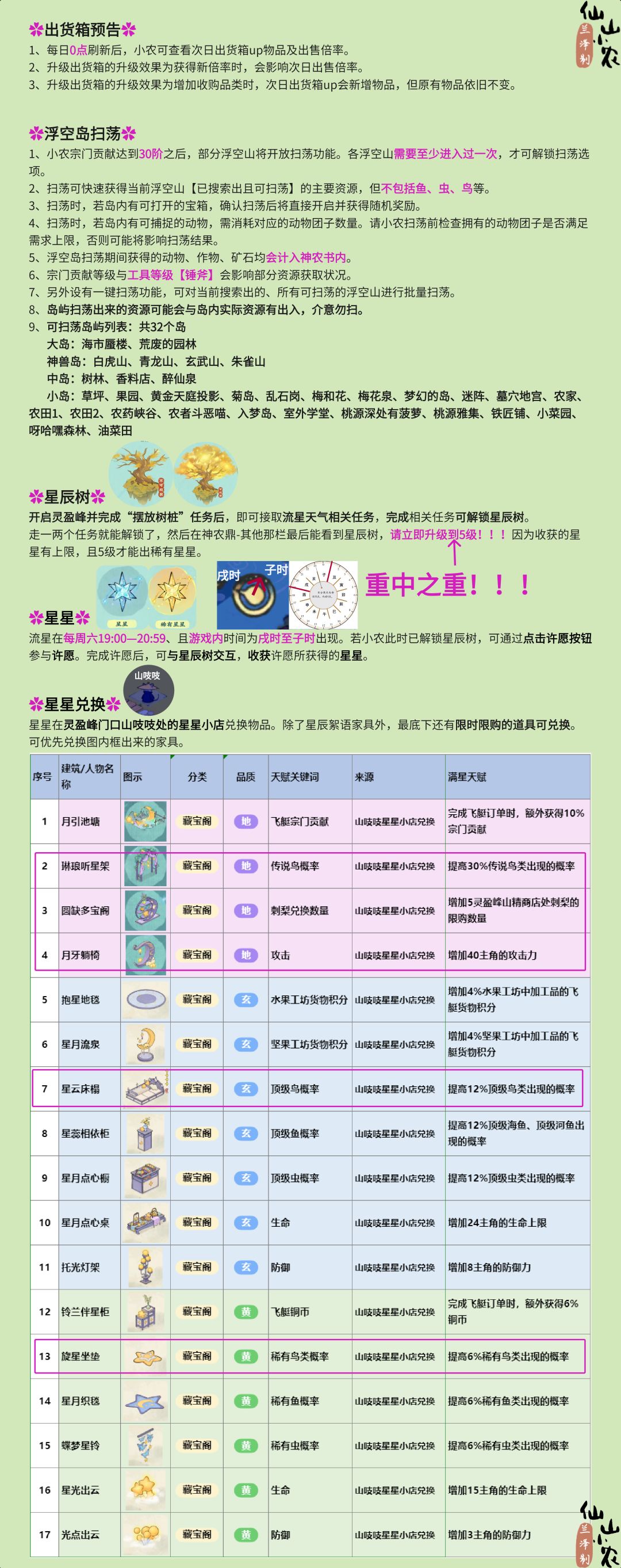 首先上面的表格是按利润从大到小排序 怎么利用这张表呢? 其实这张表的作用就是,在你种水果之余,提醒你备点什么菜,因为水果时间不是很长嘛,在水果的时间段里面,你的磨房和篝火也能同时运行 首先你的售货板如果有一点几倍的水果的话,你就种水果,(如果有两种及以上水果,种时间长的那个)。你可以先算一下到今晚12点之前,大概可以种几波。比如种三波时间不够,种两波时间又有剩余,你可以利用这个剩余的时间种点蔬菜备