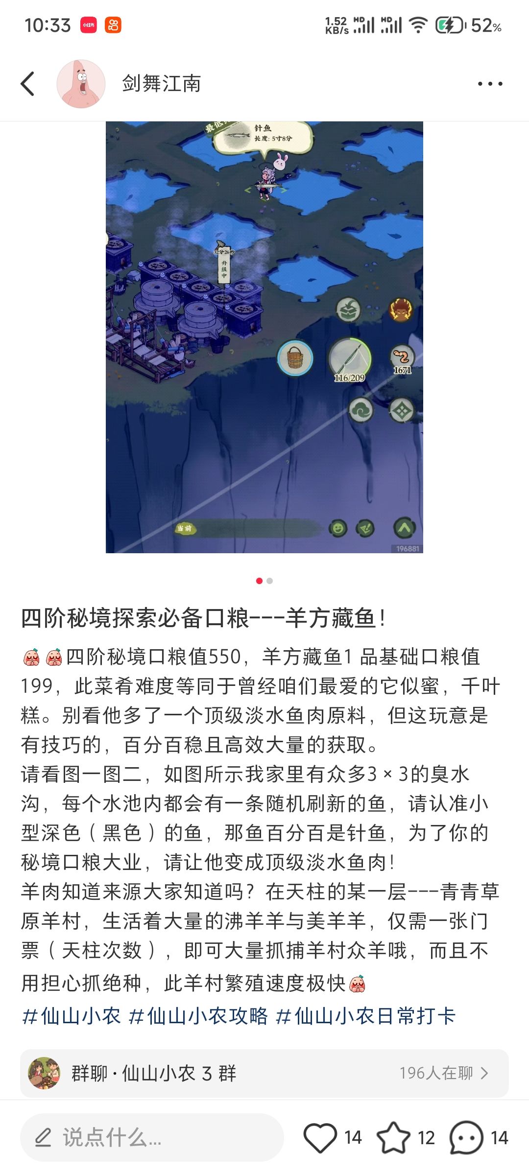 玩了一个月已经常态化了,有鼎之后也轻松不少,盘点了下每天要做的事,和每次上线要做的事,可以对一下不要漏就好了。没空时候一天上个三四次(一次安排生产种地,其余看看秘境)也行,有空就挂着刷鱼刷虫也行。 仙山小农每日必做事项 1、收门口箱子 2、查看出货箱 3、安排种地(稻草人) 4、安排生产(神农鼎) 5、每日订单 6、门口灵石和好友灵石 7、买种子、买鱼饵、买家具 8、领礼包买草 9、天柱扫荡 1
