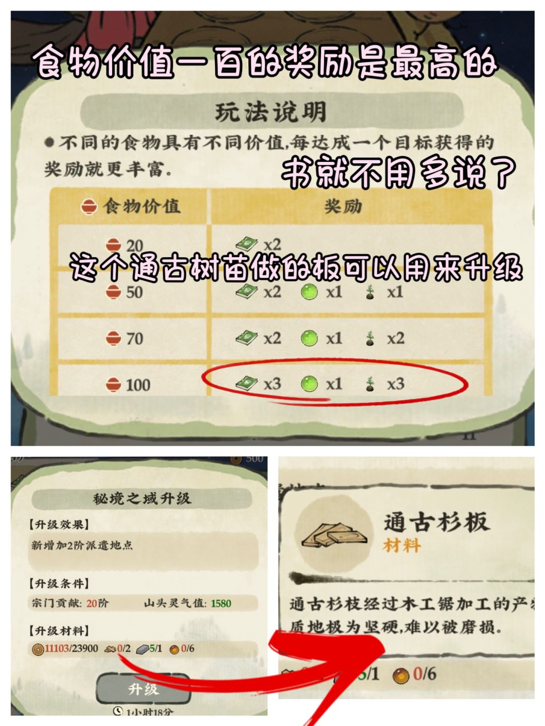 这个是升级的二阶秘境。也可以从图中看出,两百是最好的。但假如你没那么高的等级,做出那么高级的食物的话,就会很亏。而且秘境不同等级的树苗也是不同的。一级通古二级是垂龙。当然我的想法是六个珠子升级一下子拿出去。有点浪费,如果不是非常缺珠子或者是你感觉也没那么需求高的话,就没必要升级。实物的配搭的话,下面放了一张来自我们群里的大佬也可以在tap搜索看到大佬更多攻略(栉名四月)我用的是一个千页膏和三个麻婆