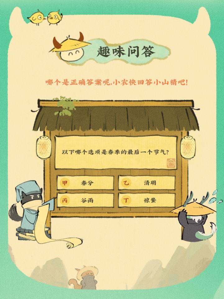 ❓️ 小农们快来呀!小山精又遇到难题啦!最近它认真学习节气知识,却在一个问题上卡住了,怎么也想不出正确答案~🧐快来看看图中的题目,帮这只好学的小山精选出正确答案吧!🎁 3月23日,小帮工会替小山精在评论区随机抽取5名回答正确的小农,送上它精心准备的春日节气礼包(浮光翎羽*5)!欢迎小农们踊跃参与,在评论区留下你的正确答案~#仙山小农 #发现好游戏 #模拟经营 #游戏安利 #游戏推荐 #种田游