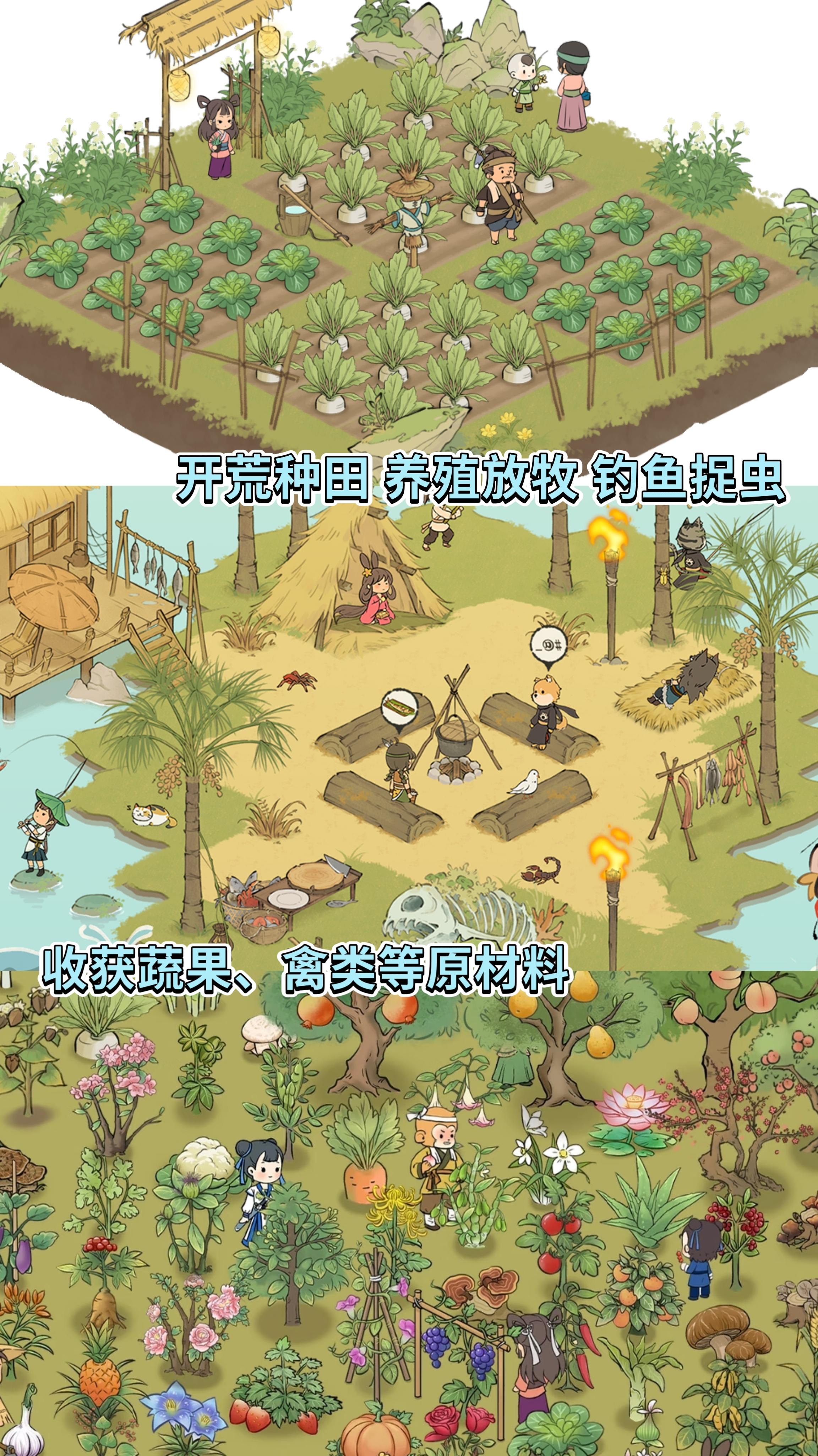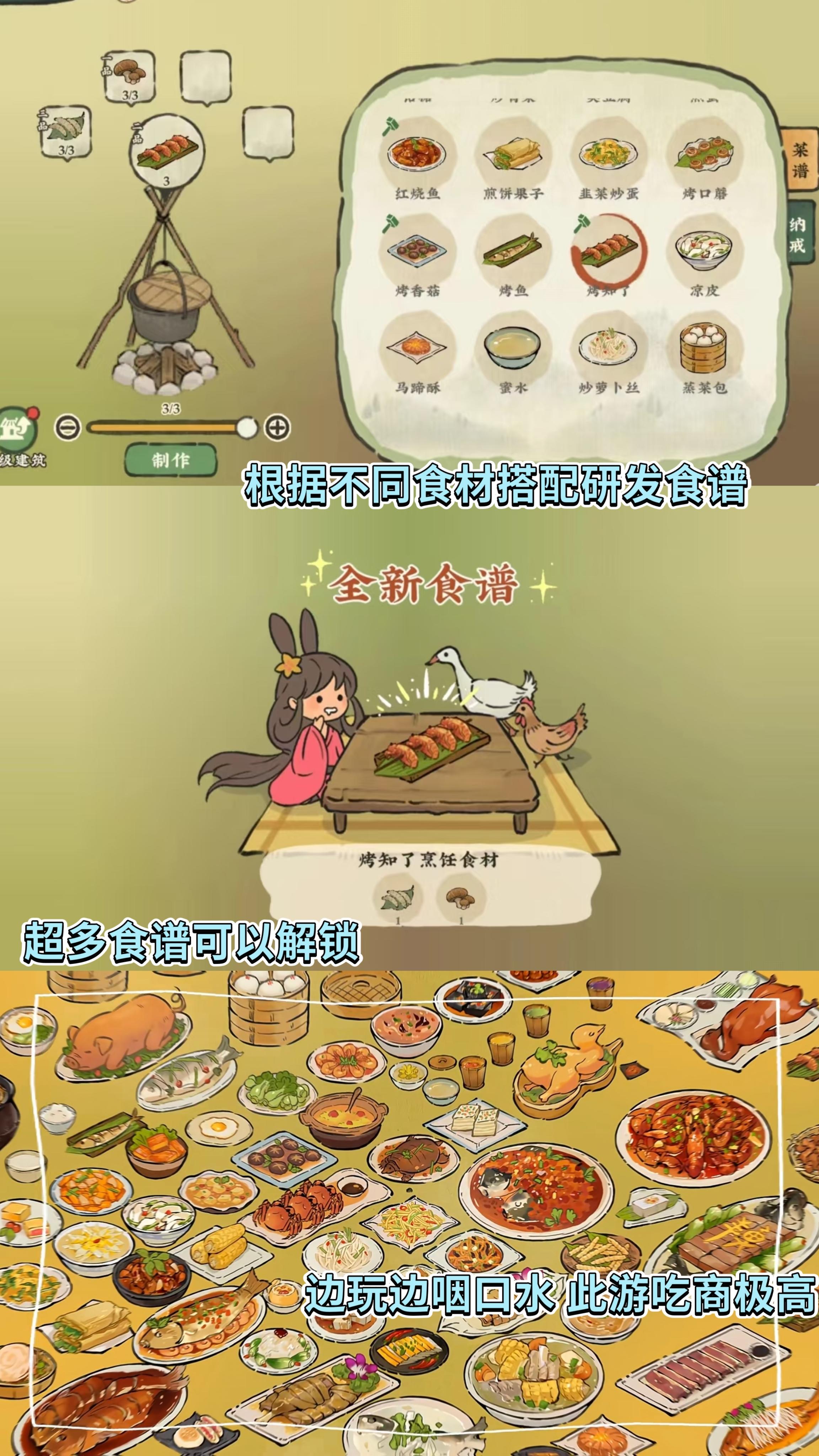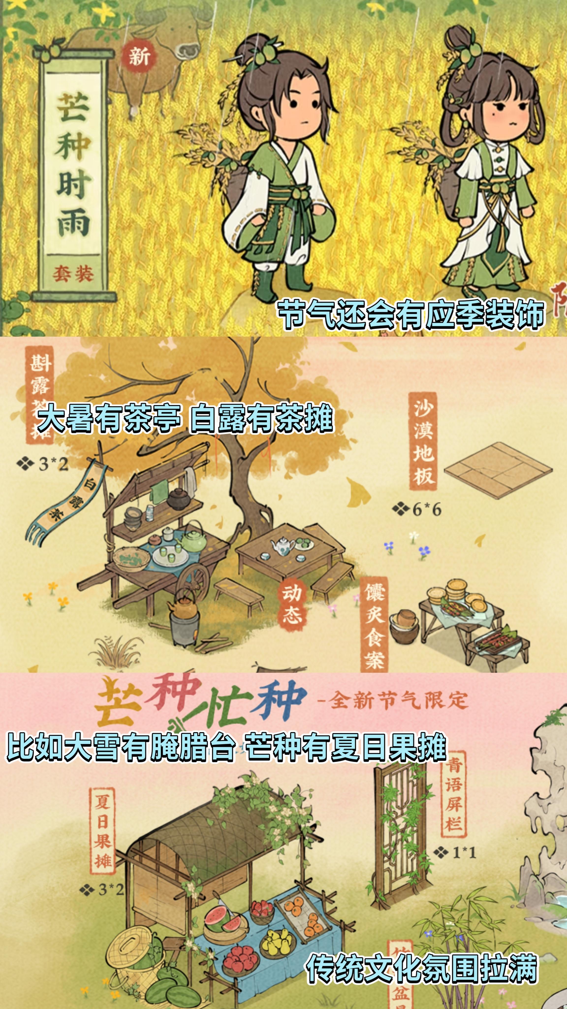 #开荒种田、养殖放牧,收获蔬果、禽类等原材料麻婆豆腐、东坡肉、烤鸭、麻辣小龙虾、开水白菜、肉夹馍、瓦罐汤、炸酥肉、马蹄酥、杏仁豆腐…超多食谱可以解锁夏天喝凉茶消暑,冬天围炉煮茶吃饺子,超有田园烟火气过节有特定美食,端午吃粽子,中秋吃月饼节气还会有应季装饰,比如大雪有腌腊台,芒种有夏日果摊,大暑有茶亭,白露有茶摊,传统文化氛围拉满限时活动能解锁特别食材,从播种开始,慢慢等待种子成熟开花,收