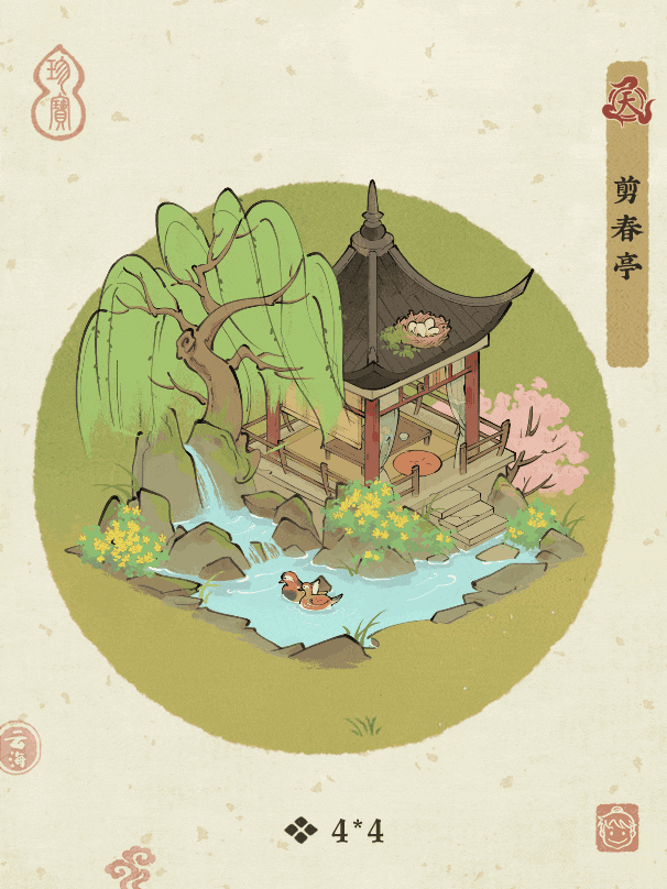 🌺建筑描述🌺剪春亭:燕尾裁烟柳,半亭春水痕。 🌺星级解锁功能🌺1星动画:春风几许2星动画:双宿双飞3星动画:燕信如归4星解锁:「地星黄」装饰5星解锁:「迎春花盆栽」装饰6星解锁:「石潭流水」装饰 🌺建筑满星属性预览🌺1、减少15%所有建筑的建造升级时间。2、减少10%学识升级消耗的铜币数量。3、每成功捕获5只虫子,增加12主角的攻击力,上限120。🌺建筑故事🌺那年春