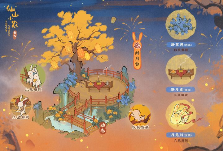 【建筑描述】拜月台:月华圆满正秋中,天上人间此夕同。星级解锁功能:1星动画:白兔夜观月2星动画:白兔对吹笙3星动画:白兔舞琵琶4星解锁:「静蓝茵」图纸5星解锁:「祭月桌」图纸6星解锁:「月兔灯」坐骑【建筑满星属性预览】1、增加15%强化北冥池时获得的强化经验。2、增加120主角的攻击力。【建筑故事】在桂花飘香的山谷里,住着一群耳朵竖得老高、鼻子总是一耸一耸的小兔子。它们