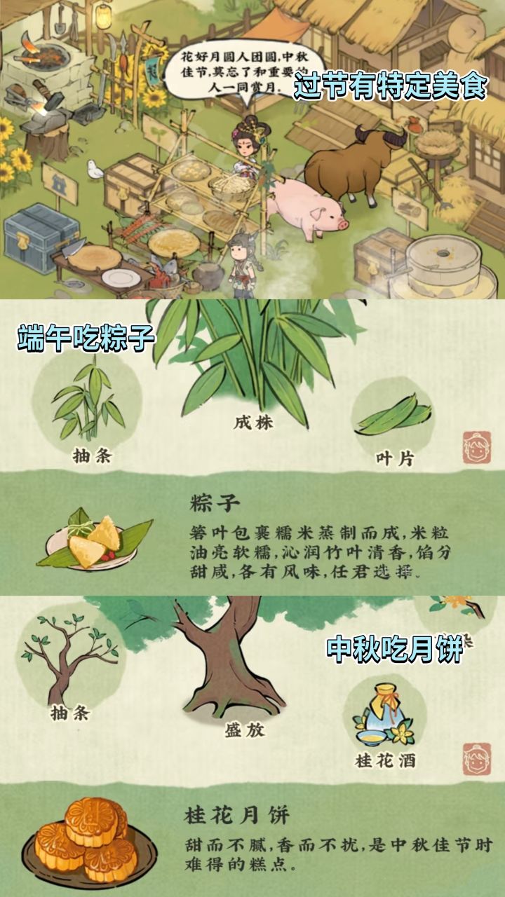 #开荒种田、养殖放牧,收获蔬果、禽类等原材料麻婆豆腐、东坡肉、烤鸭、麻辣小龙虾、开水白菜、肉夹馍、瓦罐汤、炸酥肉、马蹄酥、杏仁豆腐…超多食谱可以解锁夏天喝凉茶消暑,冬天围炉煮茶吃饺子,超有田园烟火气过节有特定美食,端午吃粽子,中秋吃月饼节气还会有应季装饰,比如大雪有腌腊台,芒种有夏日果摊,大暑有茶亭,白露有茶摊,传统文化氛围拉满限时活动能解锁特别食材,从播种开始,慢慢等待种子成熟开花,收