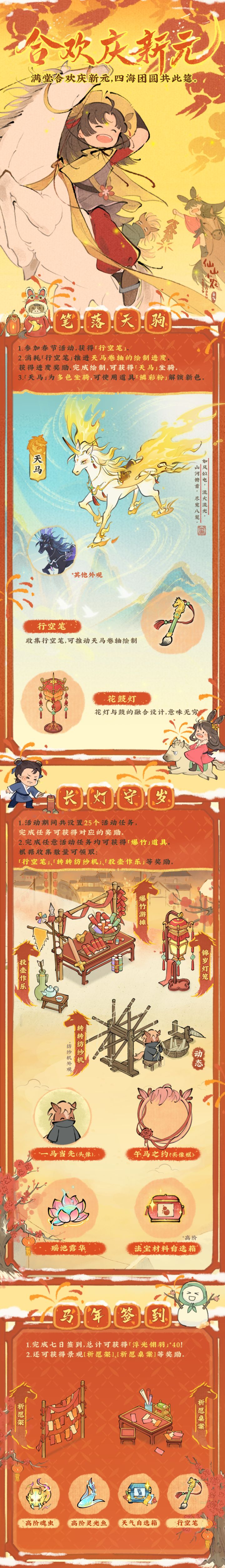 🏮马踏春风,万象更新,新年新气象!仙山春节活动「合欢庆新元」系列活动将于2月12日-3月4日热闹开启,参与活动,即可获得限定新春奖励,以下是部分活动介绍,欢迎小农前来查看~🧨笔落天驹🧨活动期间,可通过参加【年禧家宴】、【马年签到】、【山精闹春】及【长灯守岁】活动获得「行空笔」。消耗「行空笔」可推进天马卷轴的绘制进度并获得进度奖励,完成全部绘制后可获得奖励「天马」坐骑。🧨长灯守岁🧨活动期间,