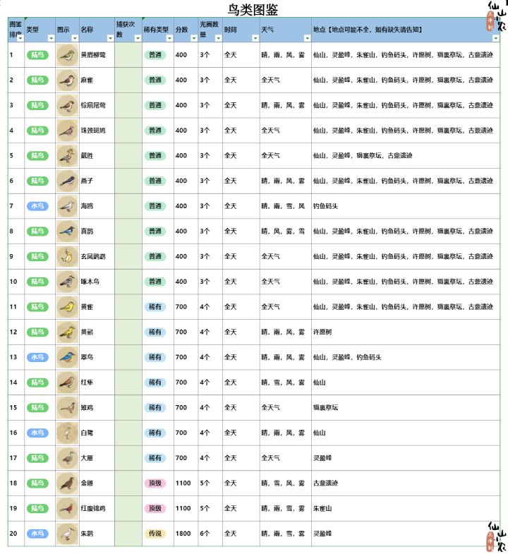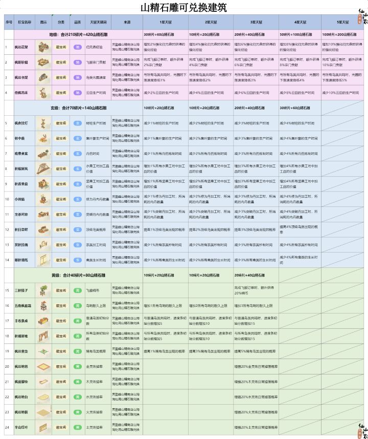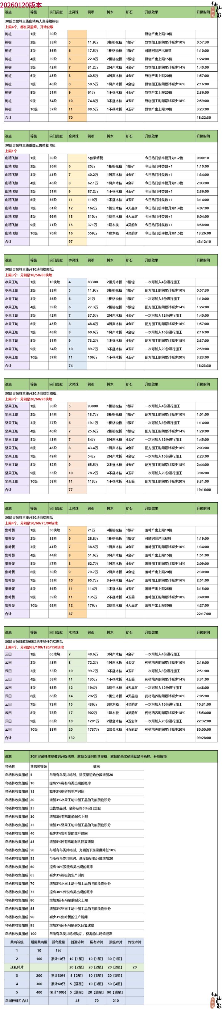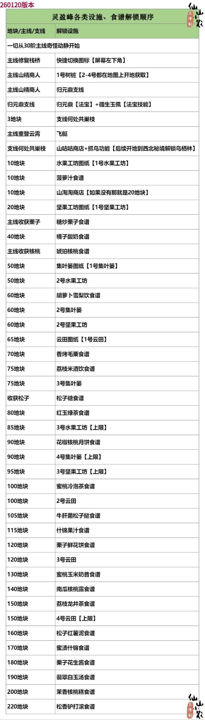 图1是昨天收集的常见问题和解答。图2是玩法简述。图3是整理的灵盈峰各功能、设施、菜谱的解锁顺序【26.1.20更新】图4是灵盈峰设施升级耗材【26.1.20更新】图5是抓鸟玩法简述图6是两大工坊新菜谱性价比图7是新菜谱做100份熟练度所需材料图8是山淘淘那山精石雕能换的建筑属性一览图9是鸟类图鉴【26.2.25更新】图10是鸟类同伴碎片概括【26.1.20新增】图11是鸟类喜好