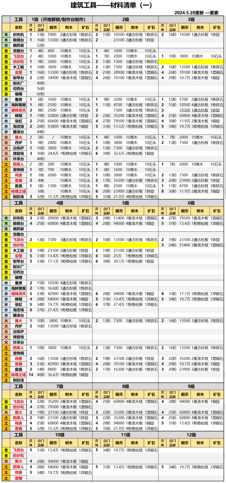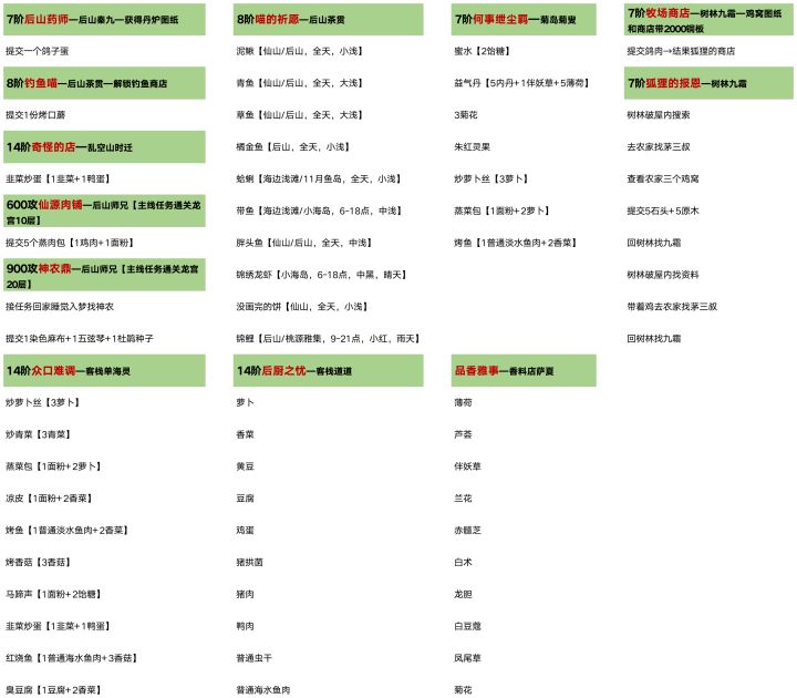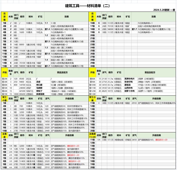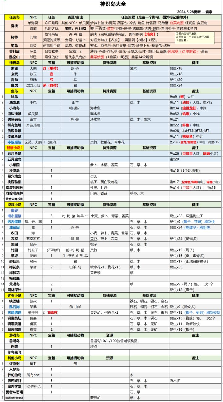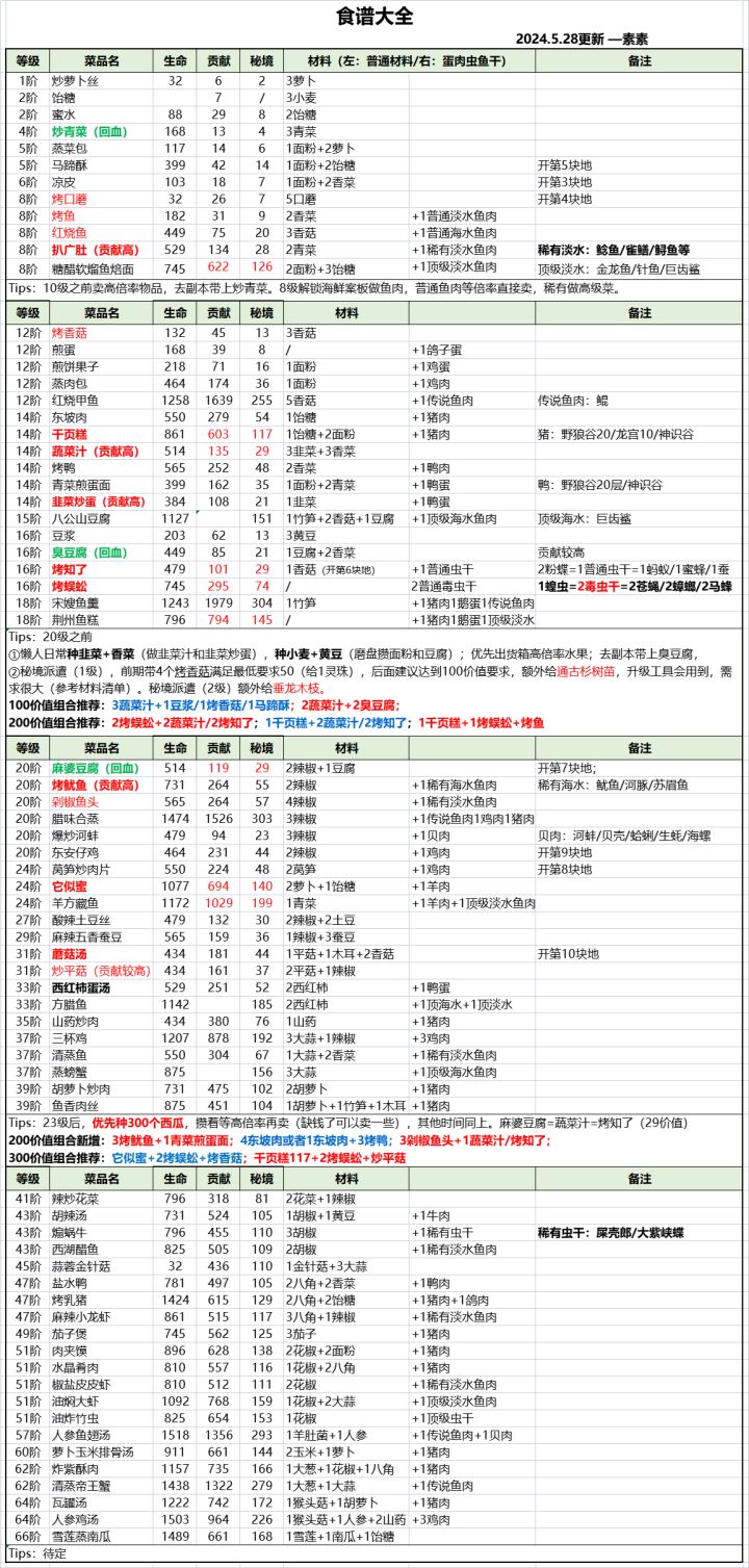 这个帖子后面会一直更新,有错误的地方留言后修正♥需要Excel的可以直接下载【腾讯文档】小农攻略(5.29素素版),仅限自用❗搬运请留言,并注明原作者和链接(刷论坛发现了另一个过去的我)2024.5.2更新了材料清单一级数据、神识岛部分数据,增加了配方大全2024.5.4增加了菜谱及派遣推荐菜、增加了鱼肉、虫干图鉴。5.8、5.11、5.13更新部分数据2024.5.19更