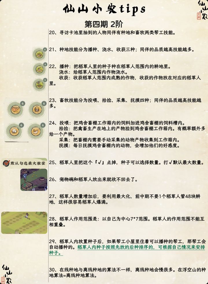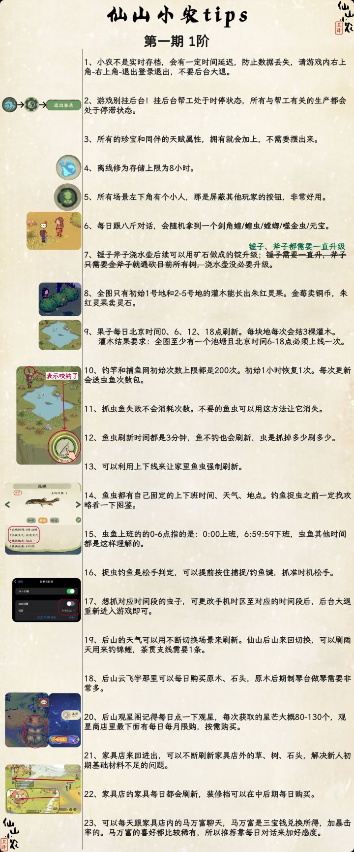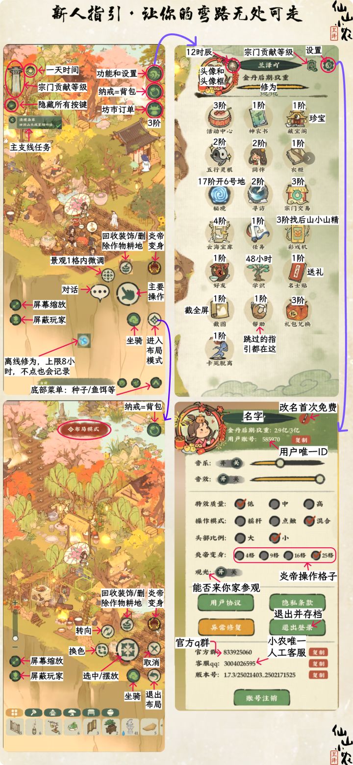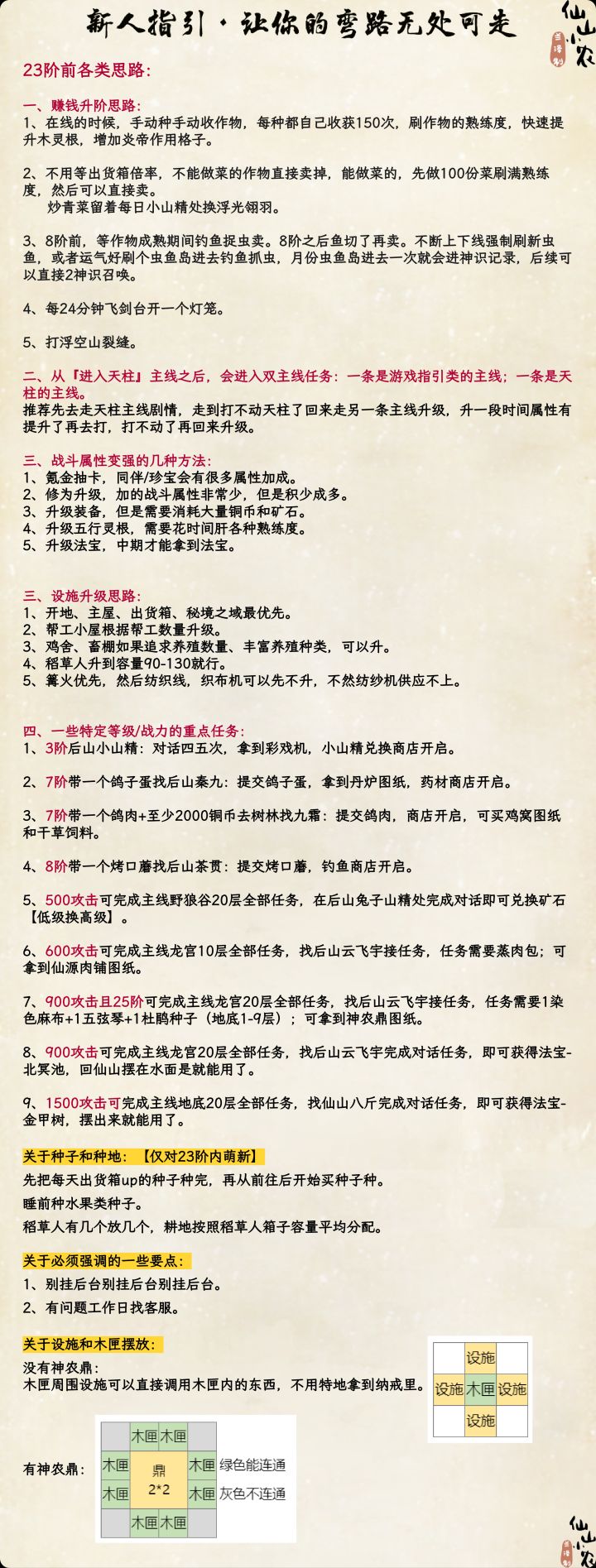 图一是总思路;图二是小农的各种操作按钮指示;图三支线任务;图四宗门贡献解锁和纳戒升级消耗;图五生产设施配方。图6-13是整理的小农tips一个攻略表,还在玩就应该会一直更新,只是更得慢点:https://kdocs.cn/l/cqUN70Wx6aZr
