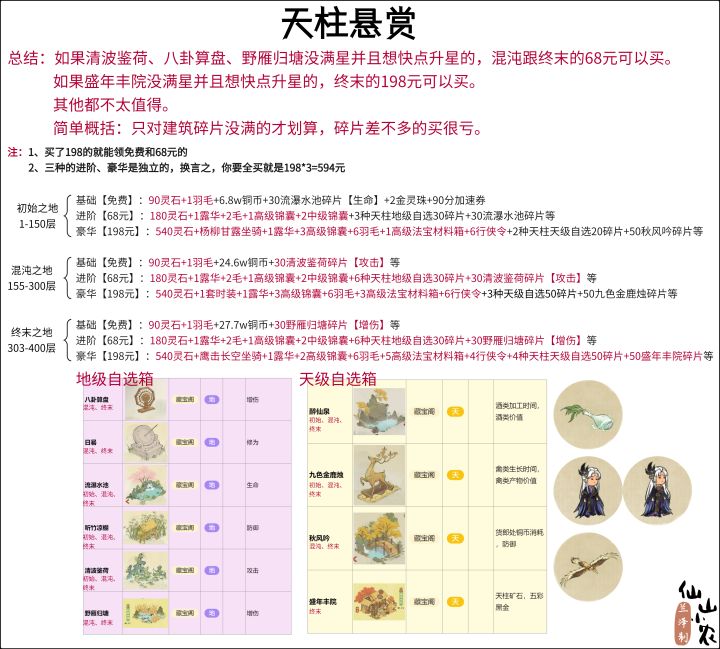 三编换图1纠错二编新增:加了一个另一种氪金分析图,那个图怎么看也都写上面了,我自己觉得很好用,看不懂就再问吧。时间比较赶攻略做的比较急,可能有算错的地方,最好自己再核对一下。#仙山小农 #仙山小农攻略 #仙山小农活动攻略