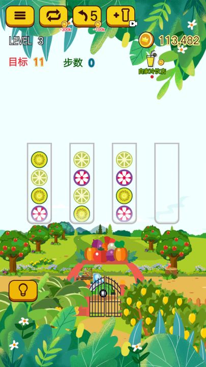 杯中的水果混杂了,请将它们重新按种类分装,杯子内相同种类的水果满了后就能做出饮料。当所有水果都做成果汁后就能轻松过关。