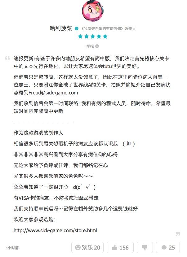 已经沦为教徒的我现在要开始给你们传教了。首先必须先安利一下这个台湾的独立游戏开发团队“有病制作”。2014年8月,他们推出了心理问答游戏《我满怀青春的有病测验》当时这款游戏凭借“清新脱俗”的画风和不走寻常路的游戏类型在上市后大获好评。随后制作人哈利菠菜发起了对续作的募资,当时募资也是因为心中有个做免费游戏的信仰。贴一张来自官方募资网站的截图。所以大家今天玩游戏的时候应该发现了,游戏下载免费而且