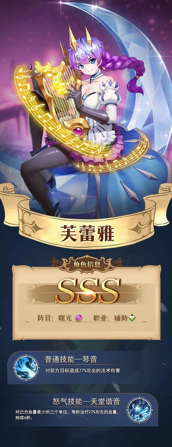 “神爱世人”芙蕾雅曾是天上的神灵,因为某些原她失去了大部分神力,坠落人间。但芙蕾雅善良慈爱的性格并没有因此发生改变。芙蕾雅奏出的琴音,能让人的心变得宁静。芙蕾雅最喜欢月亮和月桂树,这都使她回忆起曾经身为神明的自己。芙蕾雅作为一位辅助型英雄,她的技能十分的简单直接。普通技能对敌方造成法术伤害,怒气技能为己方提供较大的血量回复。