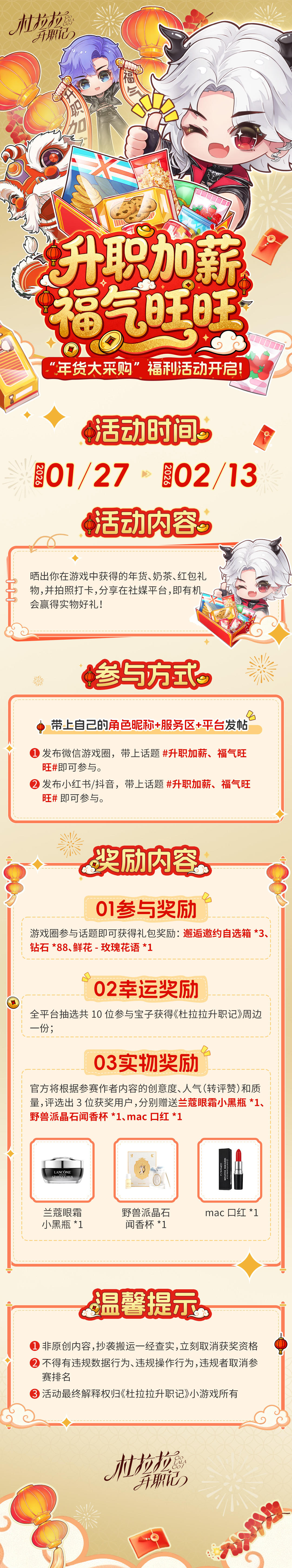 年末惊喜放送! 职场通关不止升职加薪, 还有福气满满的年货大采购!🧧 在游戏里囤了满满的年货、 喝到了幸运奶茶、抢到了红包封面? 别独自开心! 即日起—2月13日,晒出你的游戏收获截图,带上话题 #升职加薪 、福气旺旺# 发帖,就有机会赢一次额外好礼! 奖品包括:兰蔻眼霜、香薰口红、周边礼包……让这个新年,收获满满惊喜! 💡 小提示:晒出最有创意的收获组合,中奖几率更大哦~ 职场之路,既要