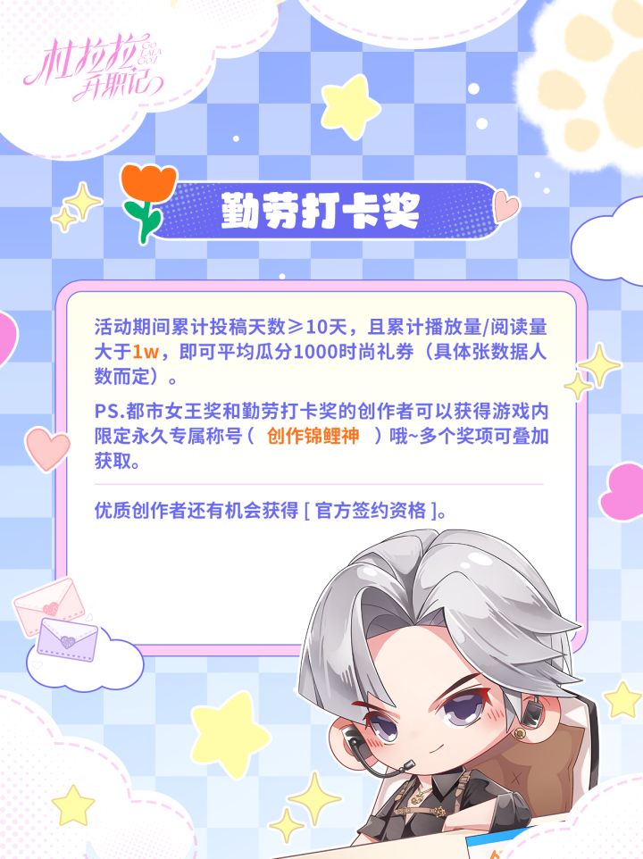 重磅消息!重磅消息!!!【杜拉拉官方创作团】第四期带着翻倍的壕礼乘风而来啦!🔥 福利炸场·双重暴击 🔥只要参与打卡,创作基金和惊喜大礼包就有机会落入你的口袋!如果你是隐藏的创作大神,千元京东卡和限定周边更是为你准备的专属嘉奖!🎨 脑洞无界·万物皆可创作 🎨无论你是玩转职场的穿搭博主,还是擅长剧情剪辑的大神;无论你钟情于杜拉拉的IP二创,还是想分享独家的职场生存秘籍……只要你有创意,