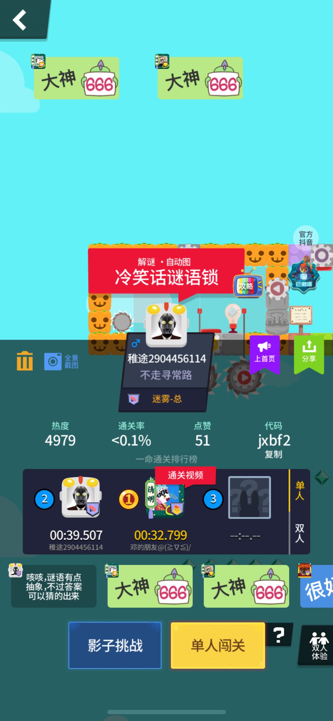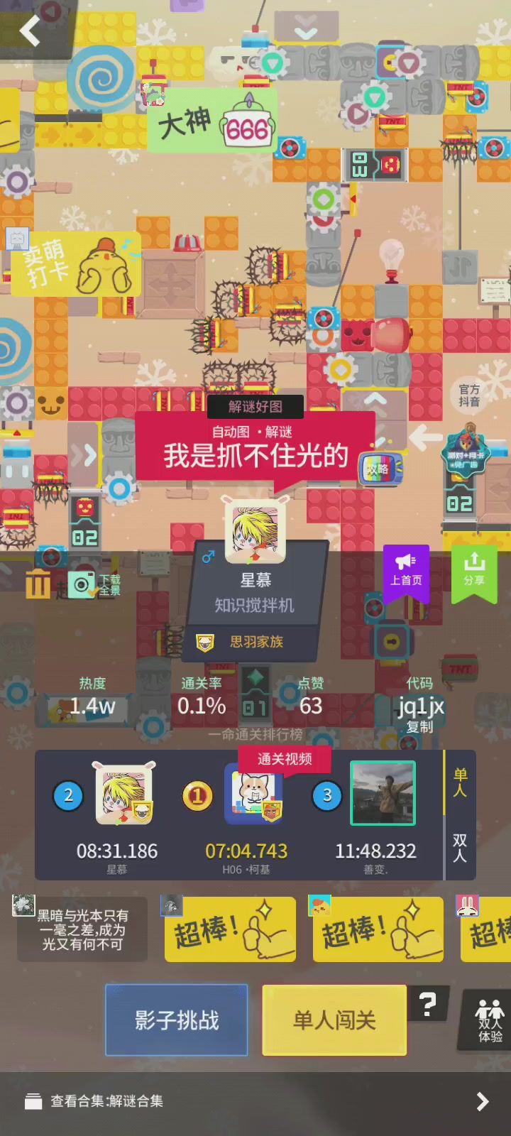 Yoda这次依旧采用了某神秘定律,把地图攒一堆审,实在让人闪避不及。而且还解锁了新技能🌚 #薛定谔的明日 犹大这招太狠了 话说,这段时间内竟然有许多佬神秘回归,那大家来找找看这期精品推荐里有哪些佬罢! 黄标区 1、《星际探险23秘密入侵》 作者:刘球Barcelona 代码itwe2 个人评分2.5💗 Yoyo评分3.8💙 感觉Yoyo有当品鉴师的潜力了(划掉) 人工:首先登场的就是最强王炸——创
