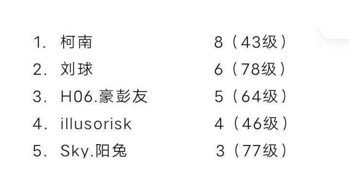 好久不见,也不知道大家还是否记得排行榜,记得第一期的排行榜在4月22日,如今,已经过去4个月了 记得4个月前,我还在为体考/中考焦虑,当时,统计排行榜的初心,现在早已忘却,但说实话排行榜是真的不好统计,可能作者喜欢统计东西吧🌚如今已经统计到第十期了 话不多说,看看排行榜中的你在第几名 1.豪彭友 150(64级) 2.刘球 122(78级) 3.邓校 94(60级) 4.小满 91(55级) 5.