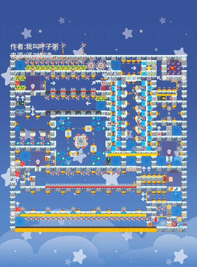 至今都不知道这个图为什么粉标这个图我做的很紧密,因为太大了不好做循环,在这么紧密的同时,还要防偷鸡,工作量很大,放了一堆移动平台,很丑,只能通过其他好看的方块来增加美观,总结美观就是又丑又美( 你猜为什么左上角太空了?数一下计数门就知道了,所以我根本做不了那么多 你们觉得这个图的通关时长大概多少?很难想象这个通关时长是两分半,能用那么久时间,却在那么小的地图通关特别难,除非使用
