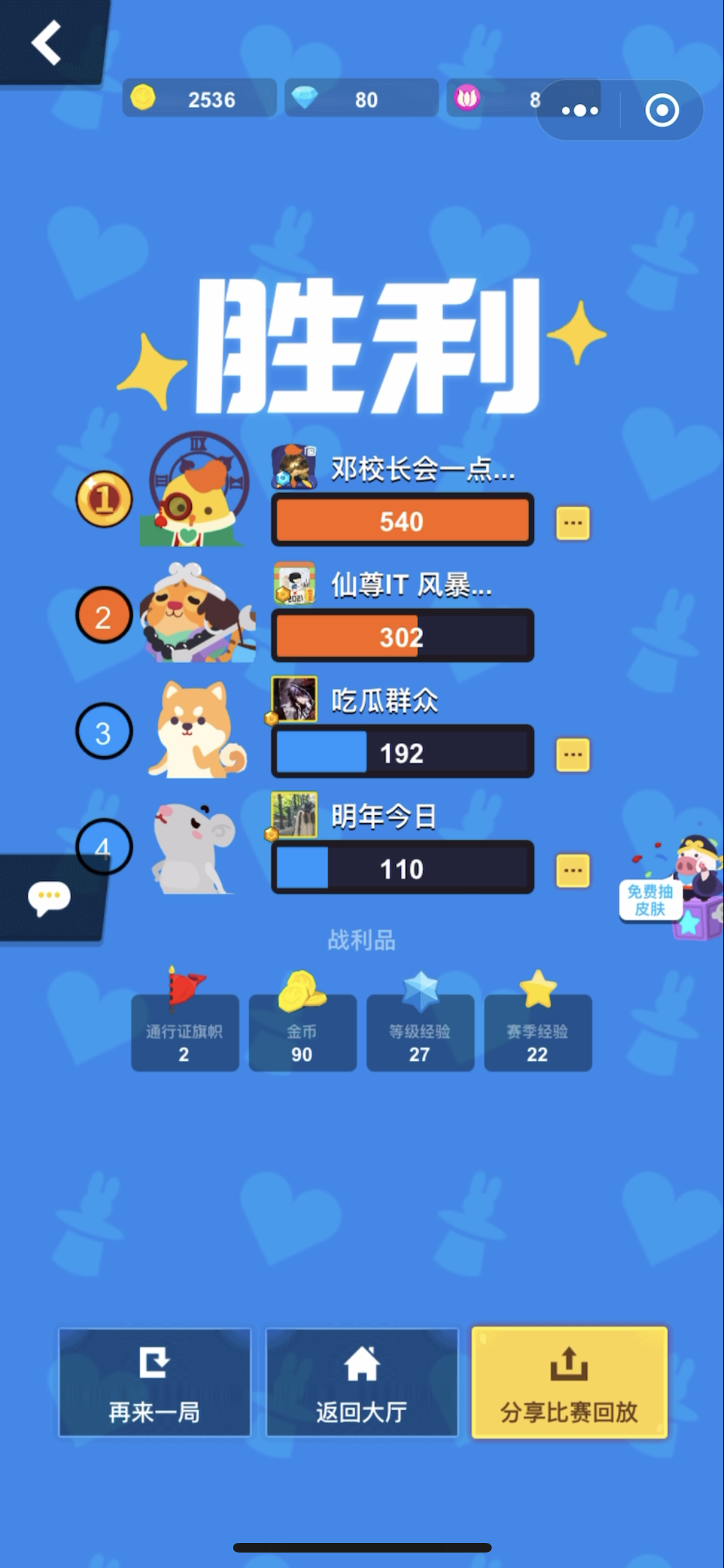 @小磨,能不能设制一个机制,双人时输的一方一个人分数比对面两个人个人分数高时,能不能给ta少许奖励。