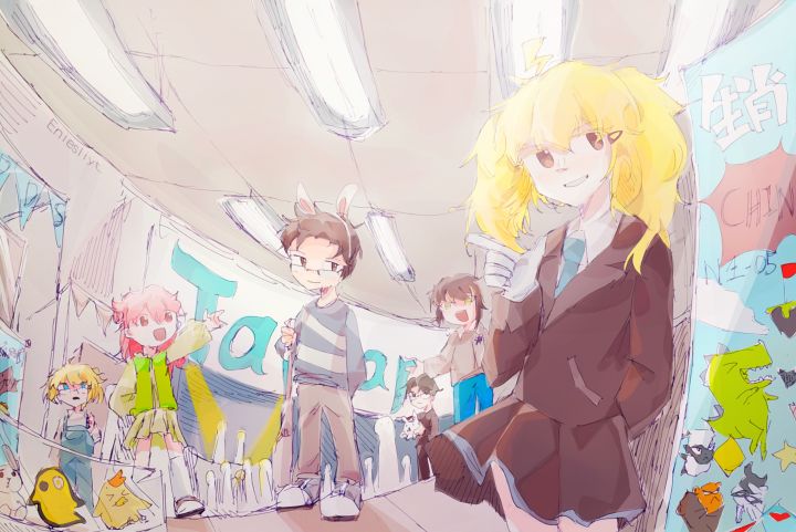 生肖派对上Chinajoy啦!一天赶出来了贺图(但是画得很潦草高饱和也不好看,草了没有去过这种展,是脑补着画的💦(明明去不了Chinajoy还硬在图上画自己的E某人是屑 )从右往左依次是推磨(小磨?)、绯血灵(自己私设)、咖啡兔(自己私设)、Benny、火柴(火柴姐别打我)、Eniesliyt(我,我是屑)